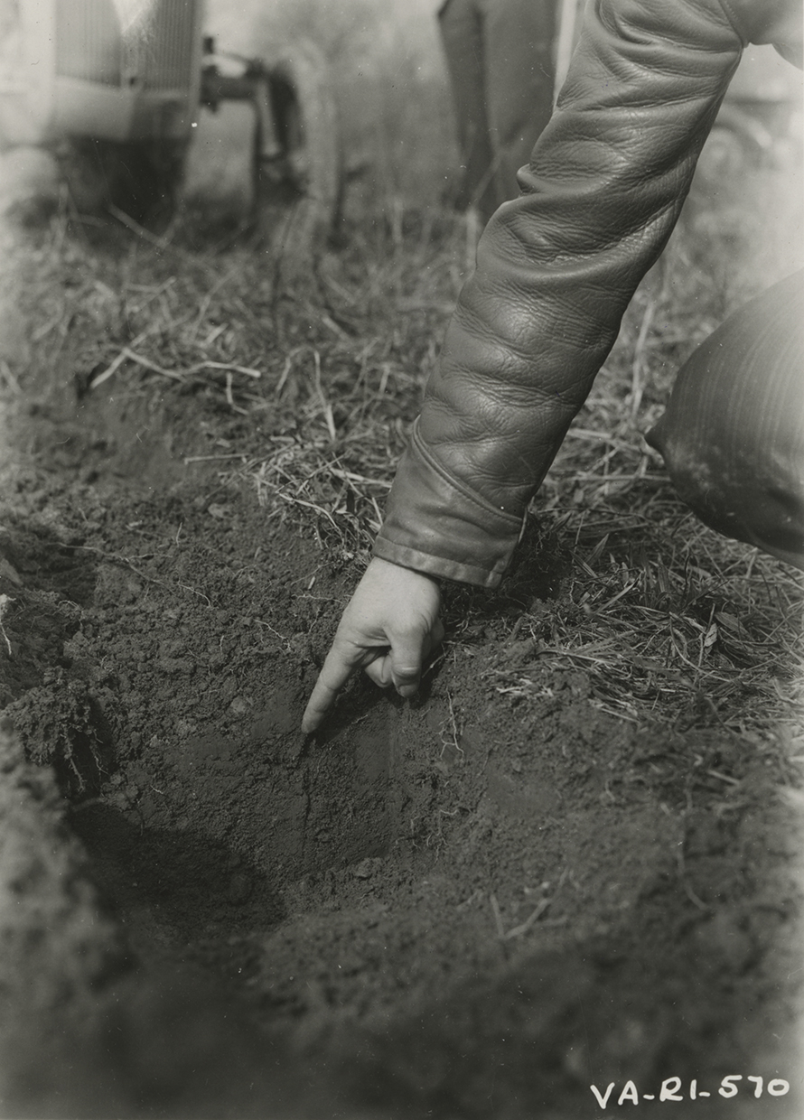 Close up of furrow following plowing with stubble mulch dual vertical cut plow. Note 3" depth and 7" depth as pointed to. Total depth of tillage is 7".