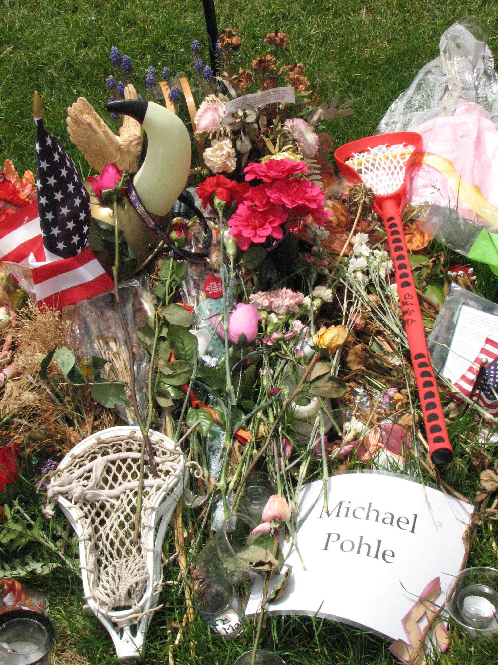 Flag, ribbons, candles, and other items on memorial stone for Michael Pohle