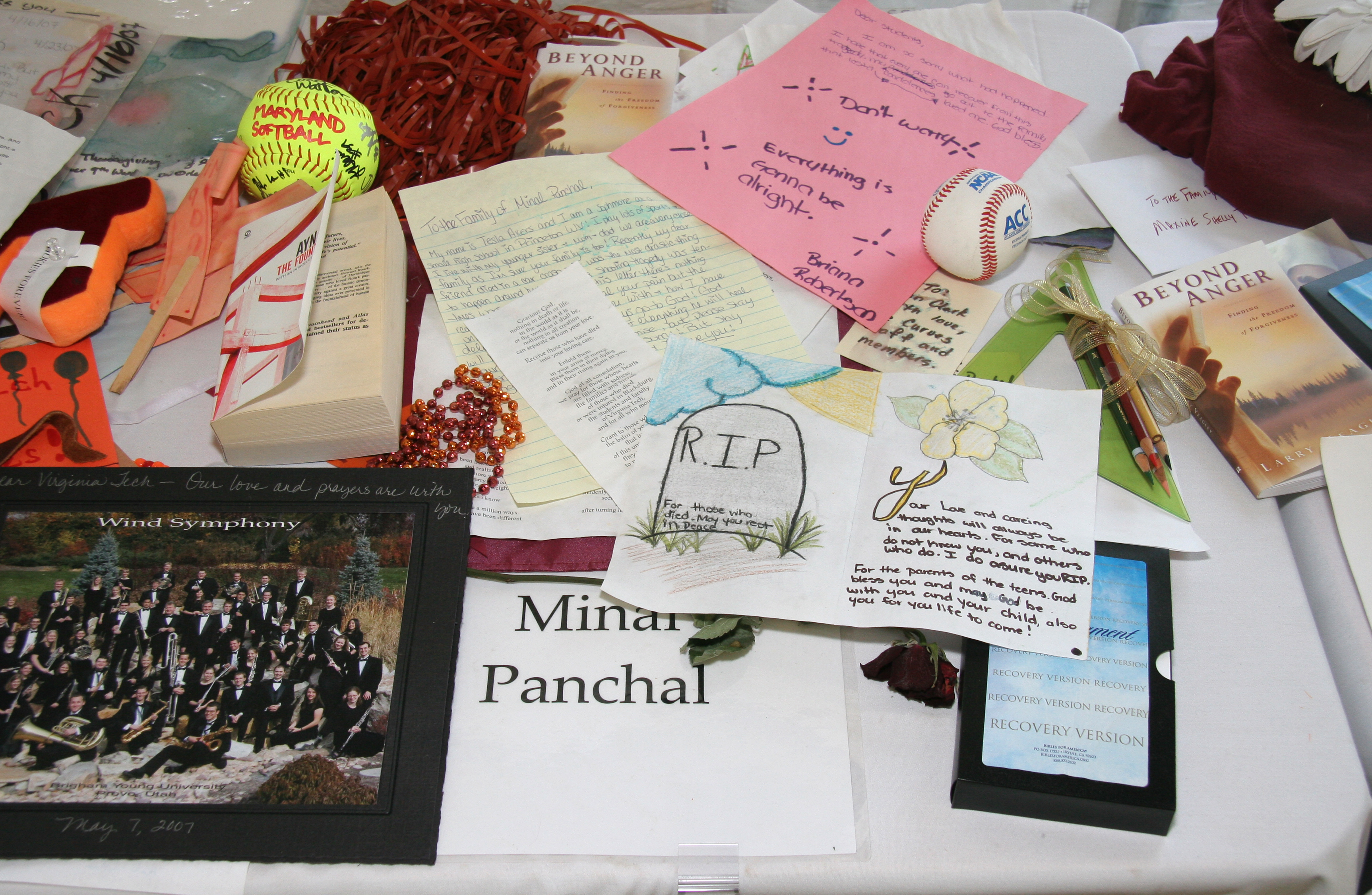 Condolence notes, rosary beads, and photographs on the Minal Panchal memorial table