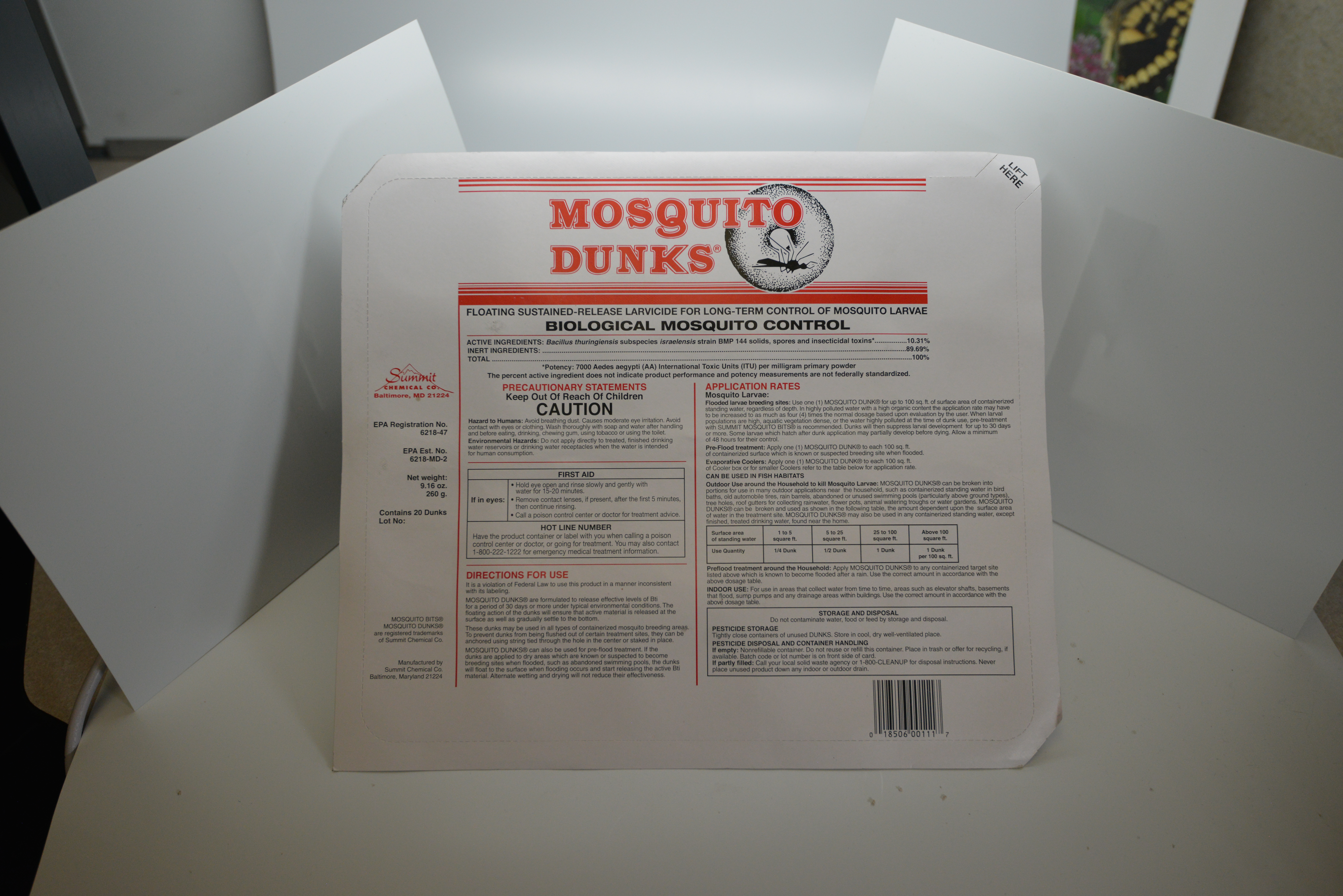 A container of Summit Chemical Company Mosquito Dunks floating sustained-release larvicide for long-term control of mosquito larvae (biological mosquito controll). Active ingredient(s): Bacillus thuringiensis israelensis (Bti). The label is a part of the packaging, which includes 20 donut-shaped dunks.