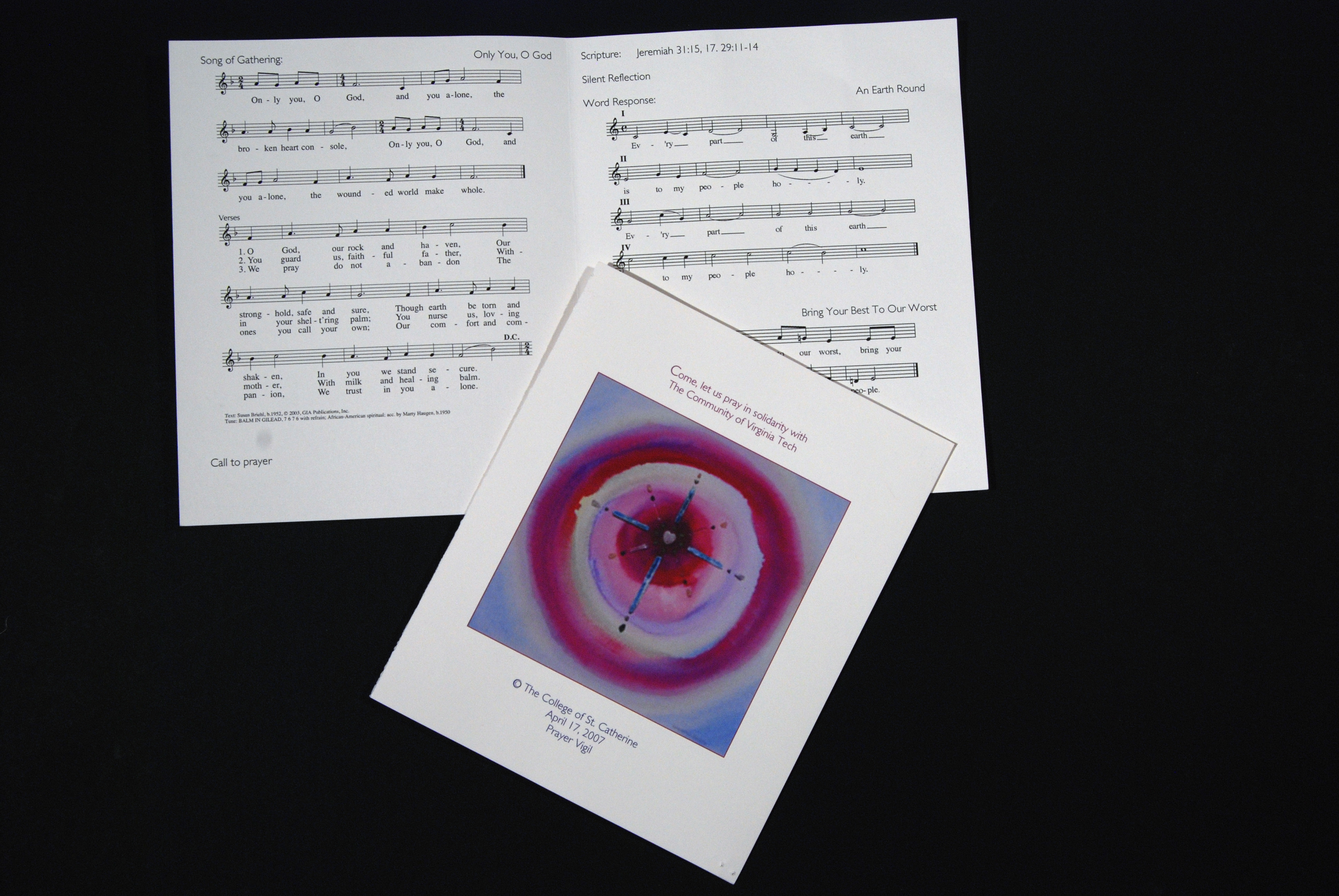 A card and a prayer vigil program with musical notes from College of Saint Catherine