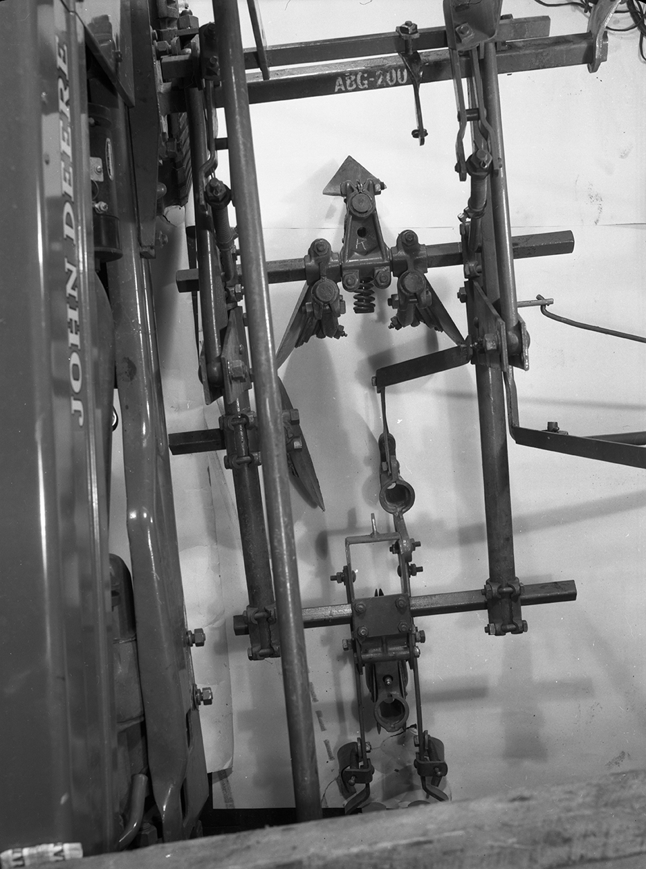 Top view of planter - seed and fertilizer boxes and shoes removed. From top to bottom shank opener, disc hillers, opening furrow disc hiller to throw loose dirt to row, fertilizer shoe, disc furrow openers