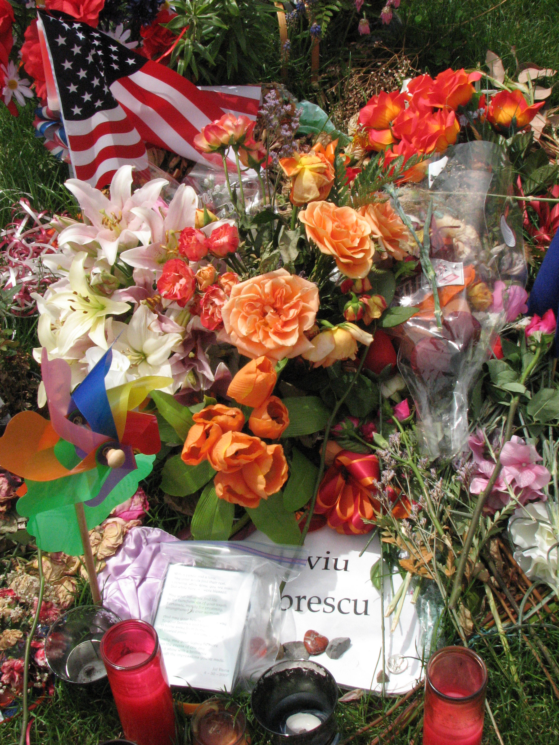 Flag, ribbons, candles, and other items on memorial stone for Liviu Librescu
