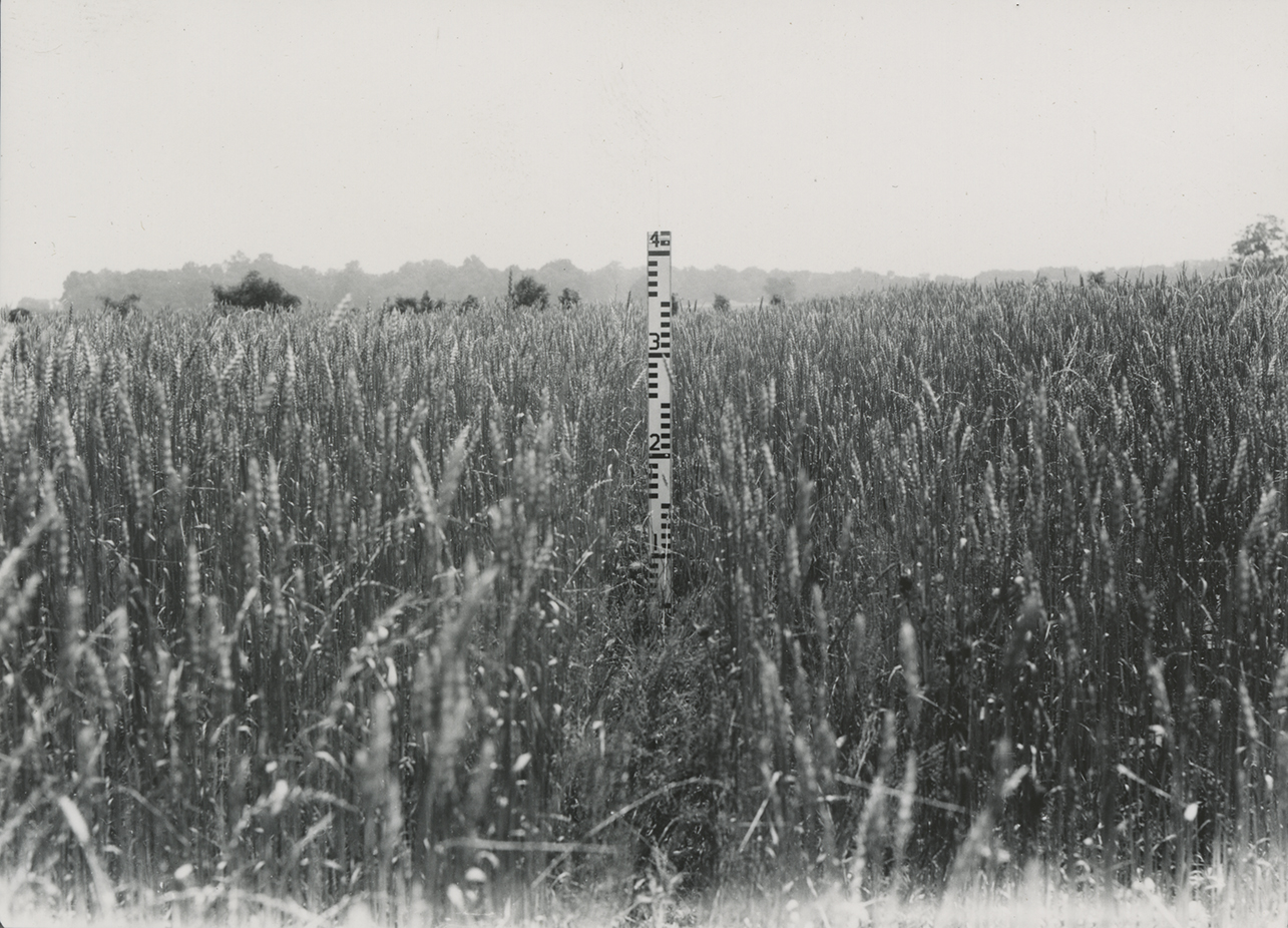 Close-up of height of wheat under multiple use drill and 4-12-4 fertilizer. Check area at left and multiple use drill with 10.7-12-4 and February top dressing right. Note increased vigor in latter treatment.
