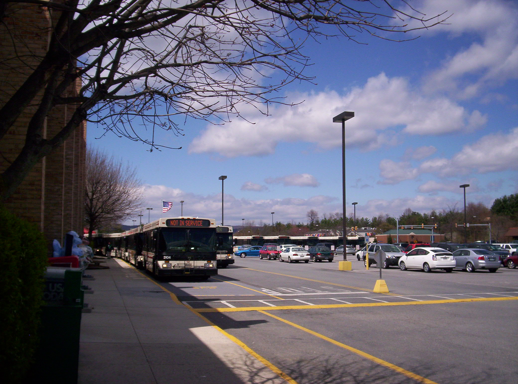 Blacksburg Transit buses in parking lot at University Mall Shopping Center on 4/16/07
