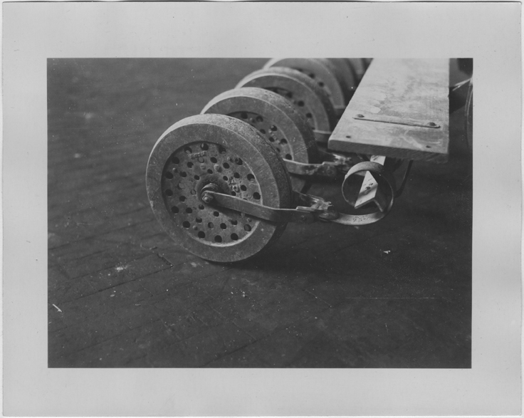Close-up of packer wheel assembly. Spring and swivel mounting to allow wheel to follow contour furrow. Experimental model of multipurpose seeder. Note old wood block floor that used to be in shop area of Seitz Hall.
