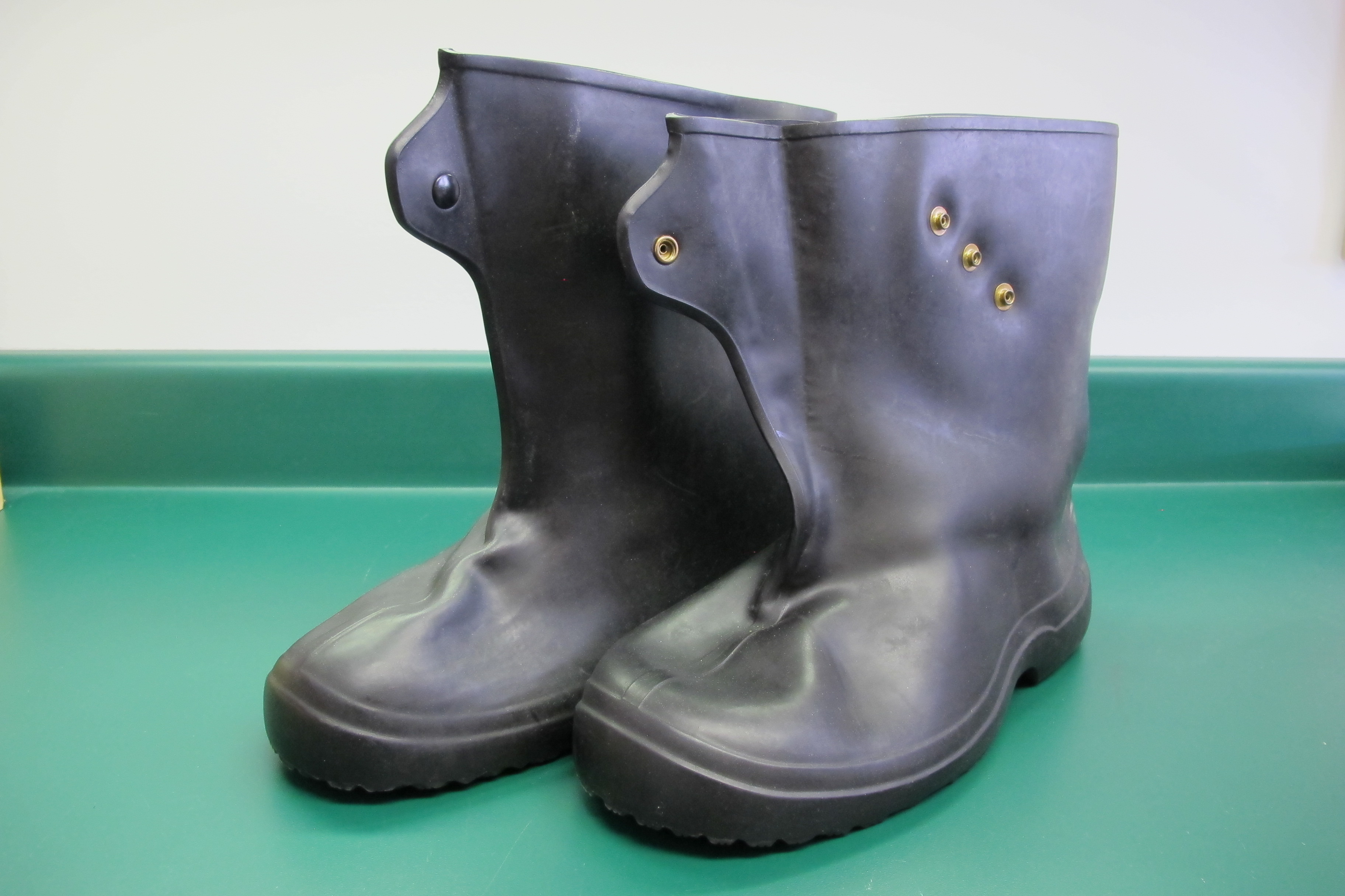 Close up of black chemical resistant rubber boots.