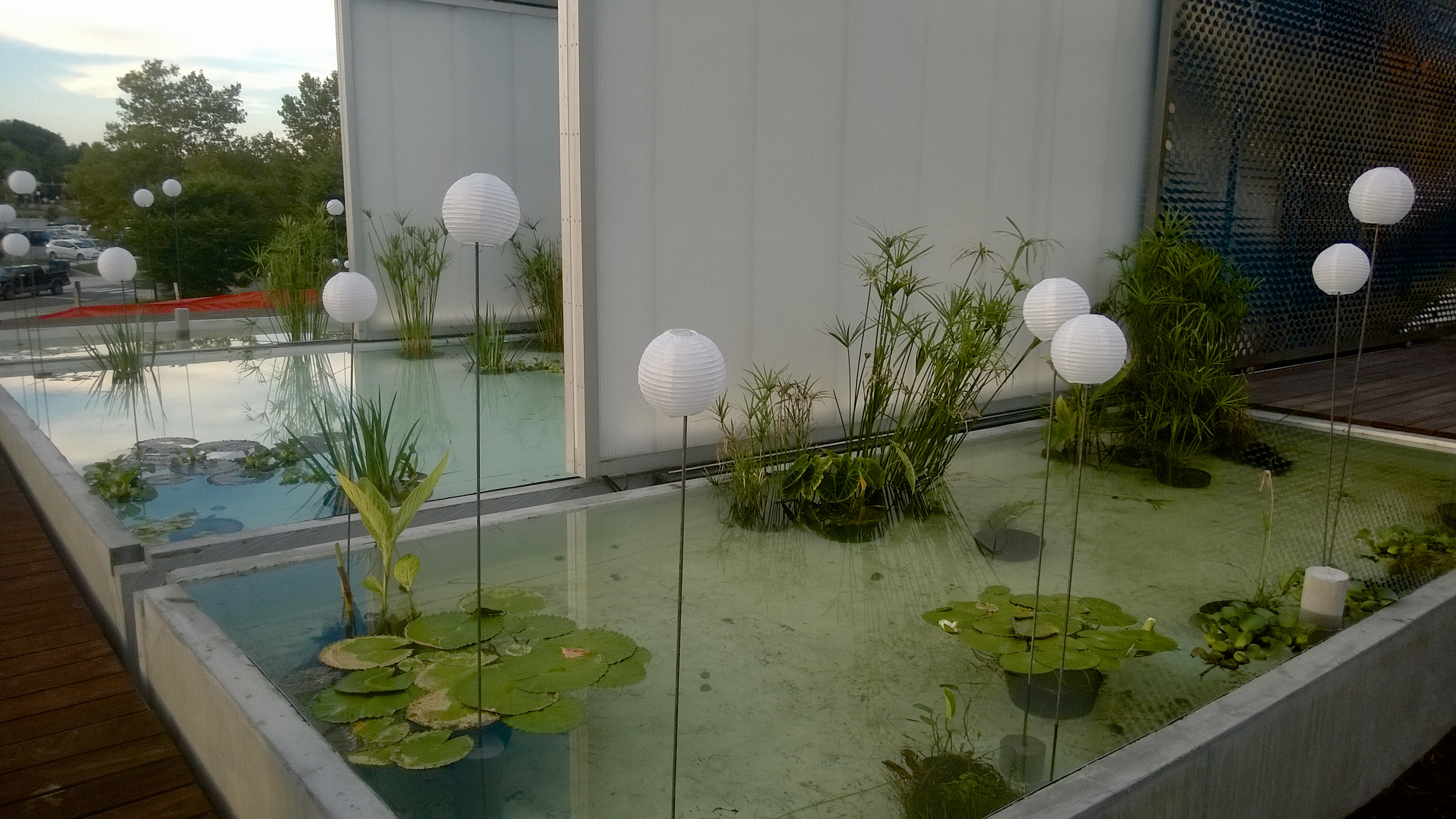 The original version of Fields + Array was exhibited at the Moss Arts Center then temporarily installed on Burchard Plaza. For the Architecture + Design reception, the concrete cylinders were recast, metal rods were inserted, and paper lanterns with self-contained light bulbs were attached. The reception took place behind Cowgill Hall.