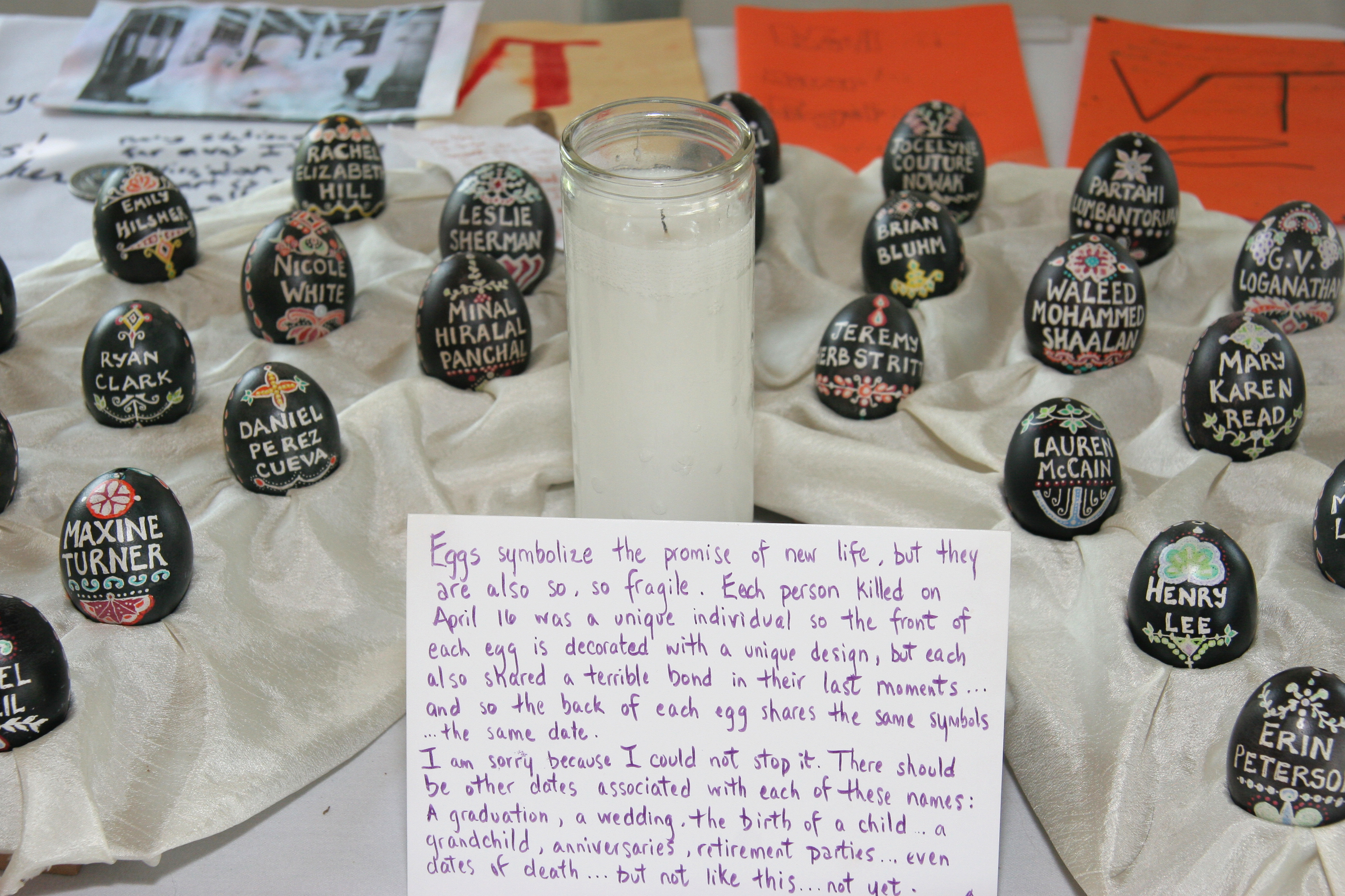 Candle, condolence note, and decorated eggs with victims' names and a unique symbol painted on each egg