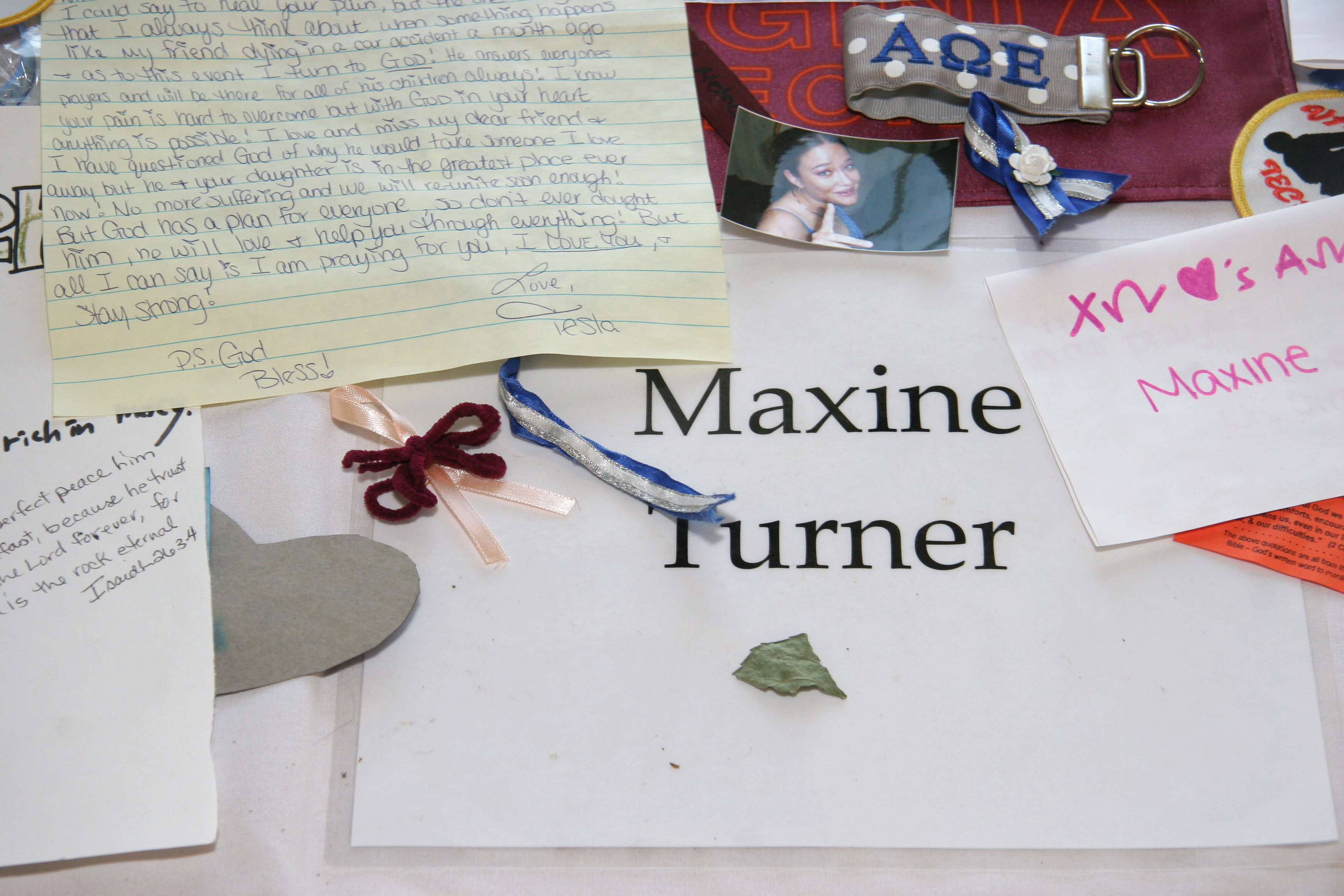 Condolence notes, photograph, and sorority key ring on the Maxine Turner memorial table