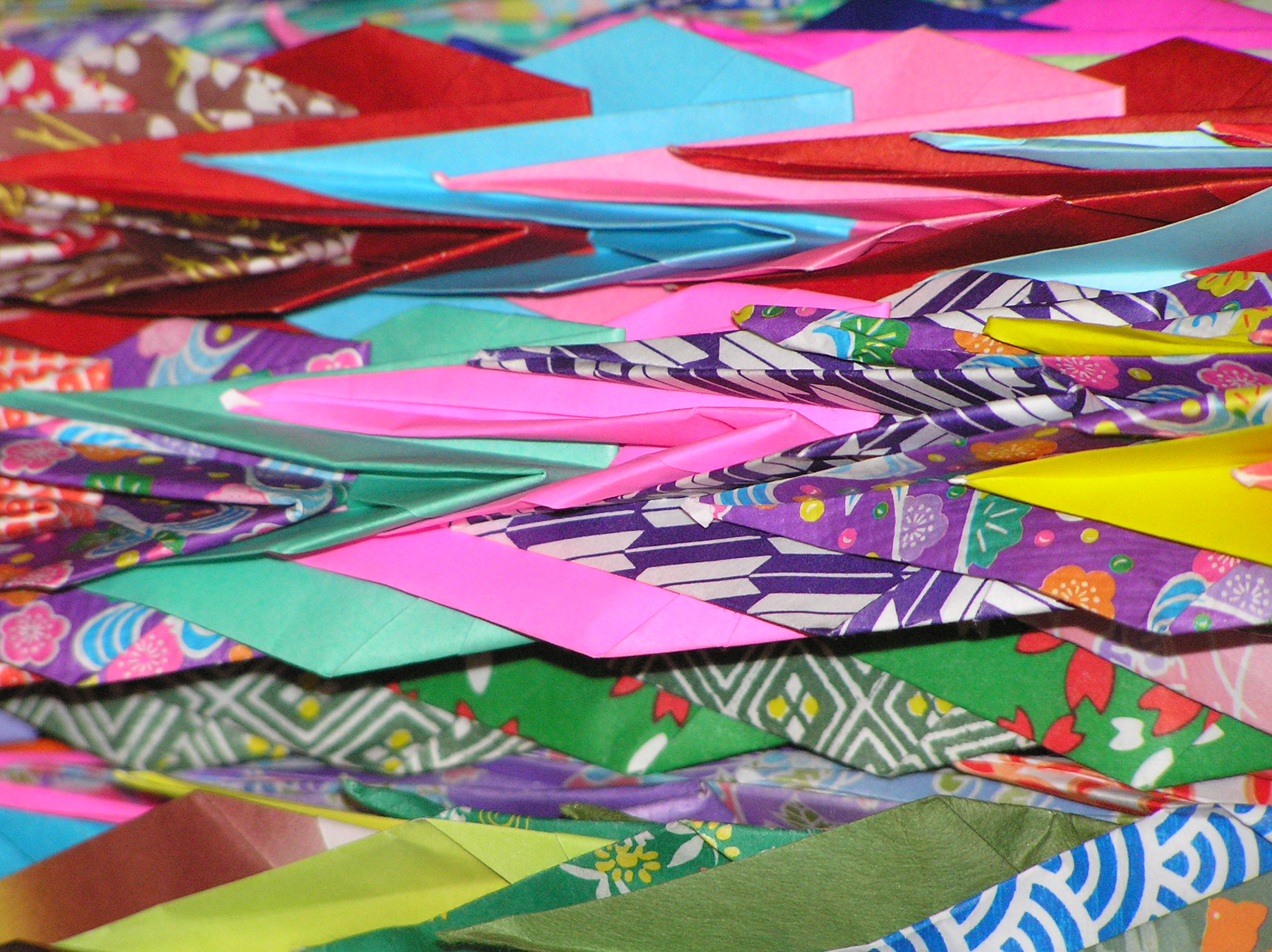 Colorful paper cranes, part of the 1000 crane project being processed at the Corporate Research Center
