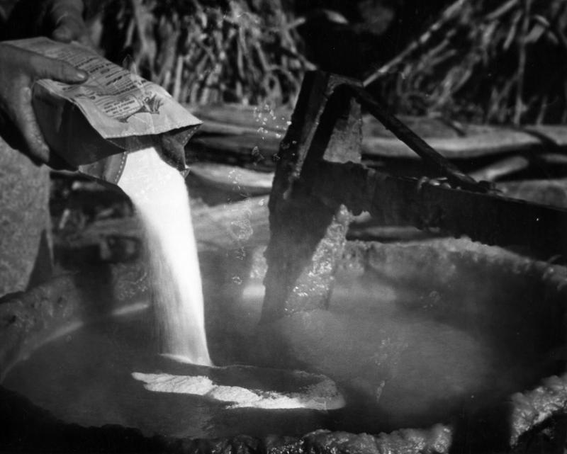 Sugar is added to the bubbling kettle two or three hours before the apple butter is taken from the fire.