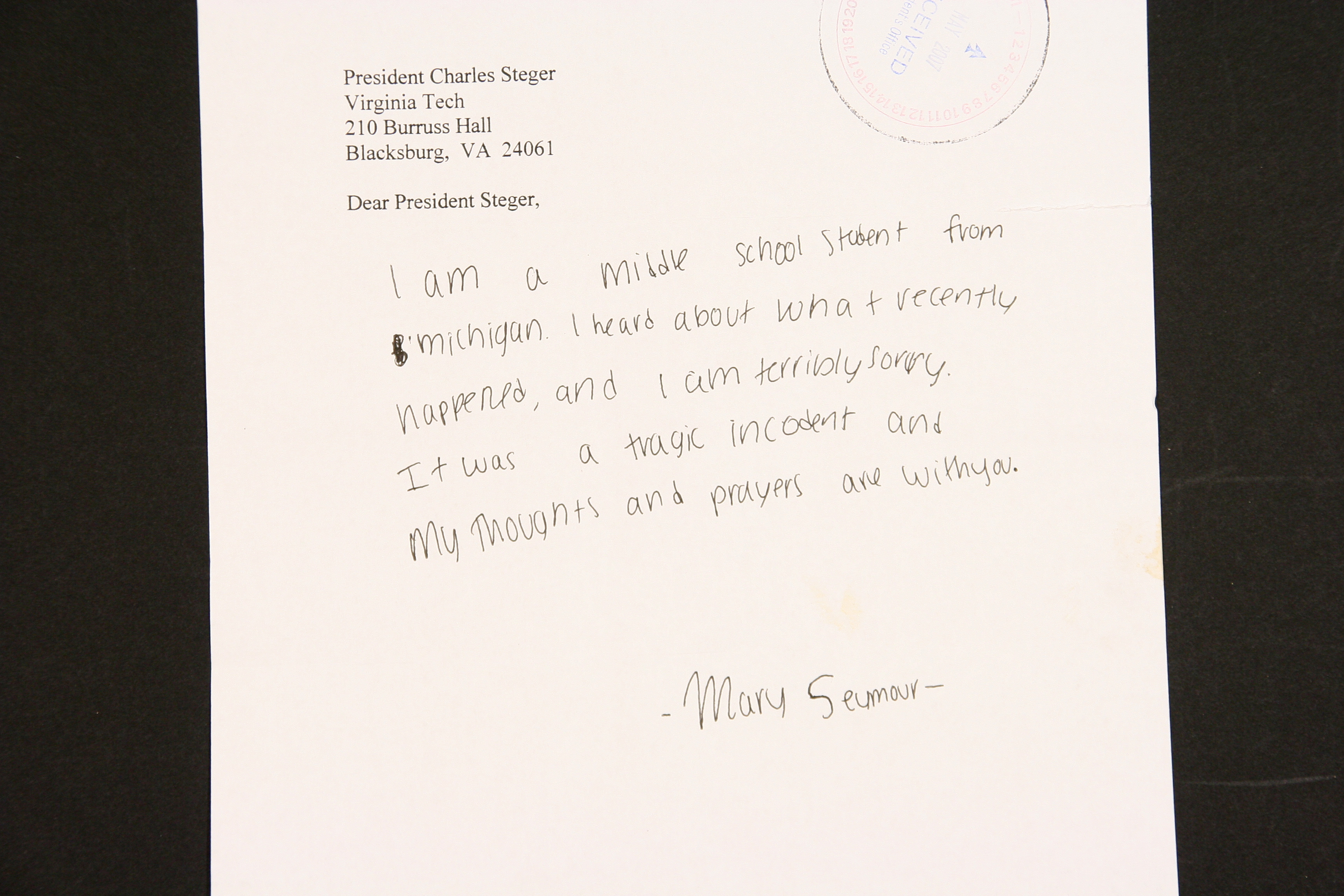 Letter to President Steger from Michigan Middle School Student, Mary Seymour