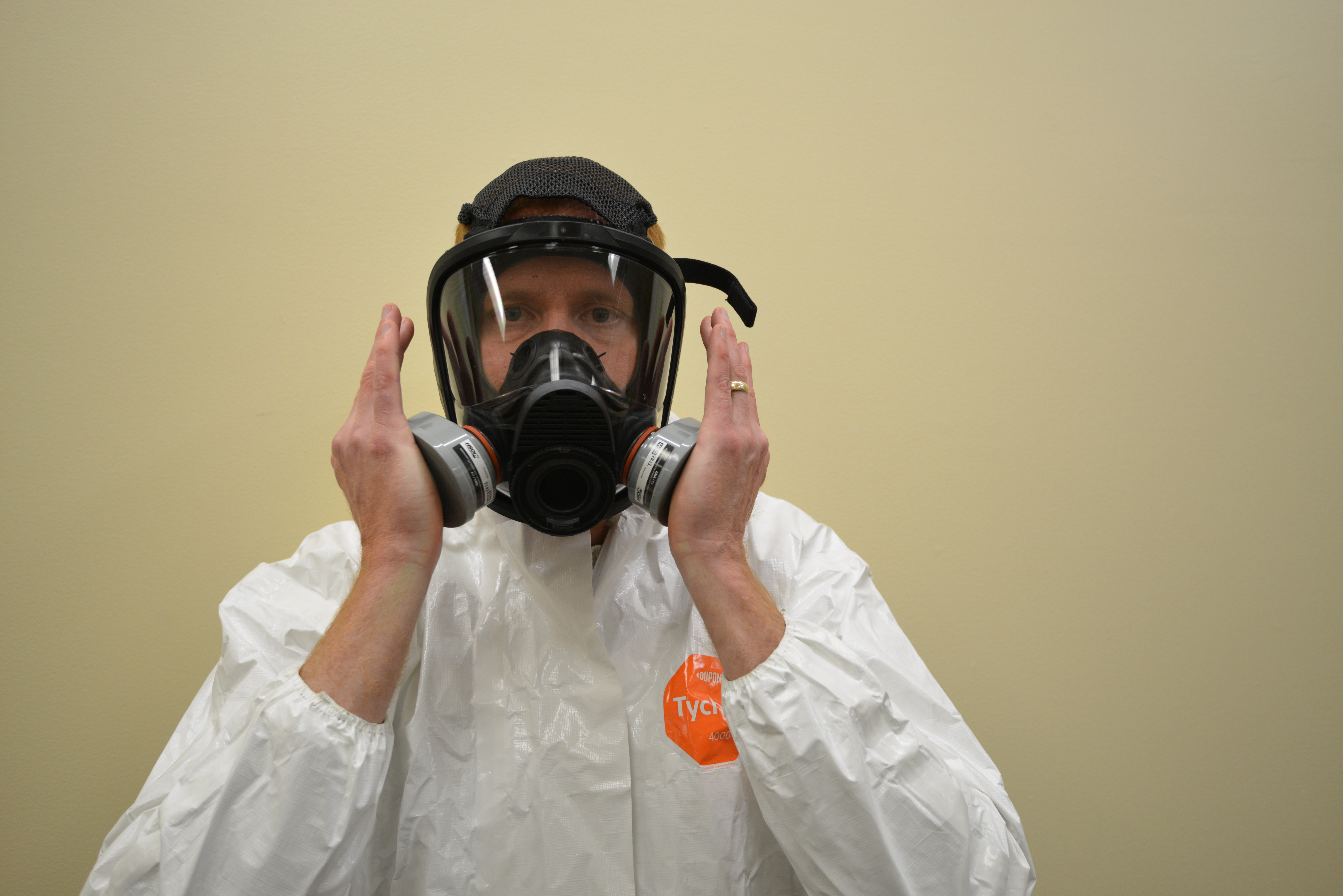| dc.description.abstract | Applicator in a chemical resistant suit performing a negative-pressure fit check for full-face respirator. | en |