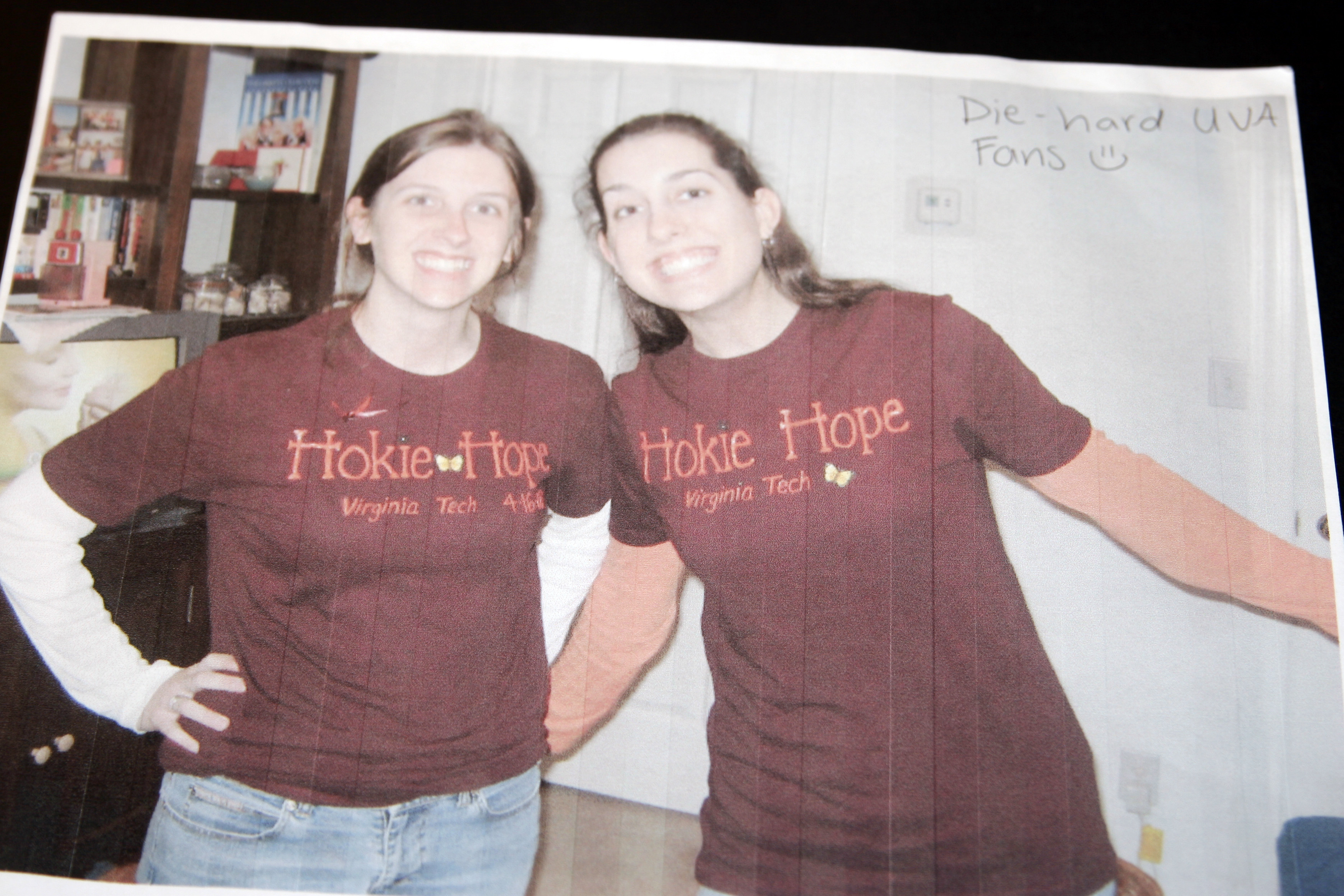 Photographs of two students wearing Hokie Hope T-shirts