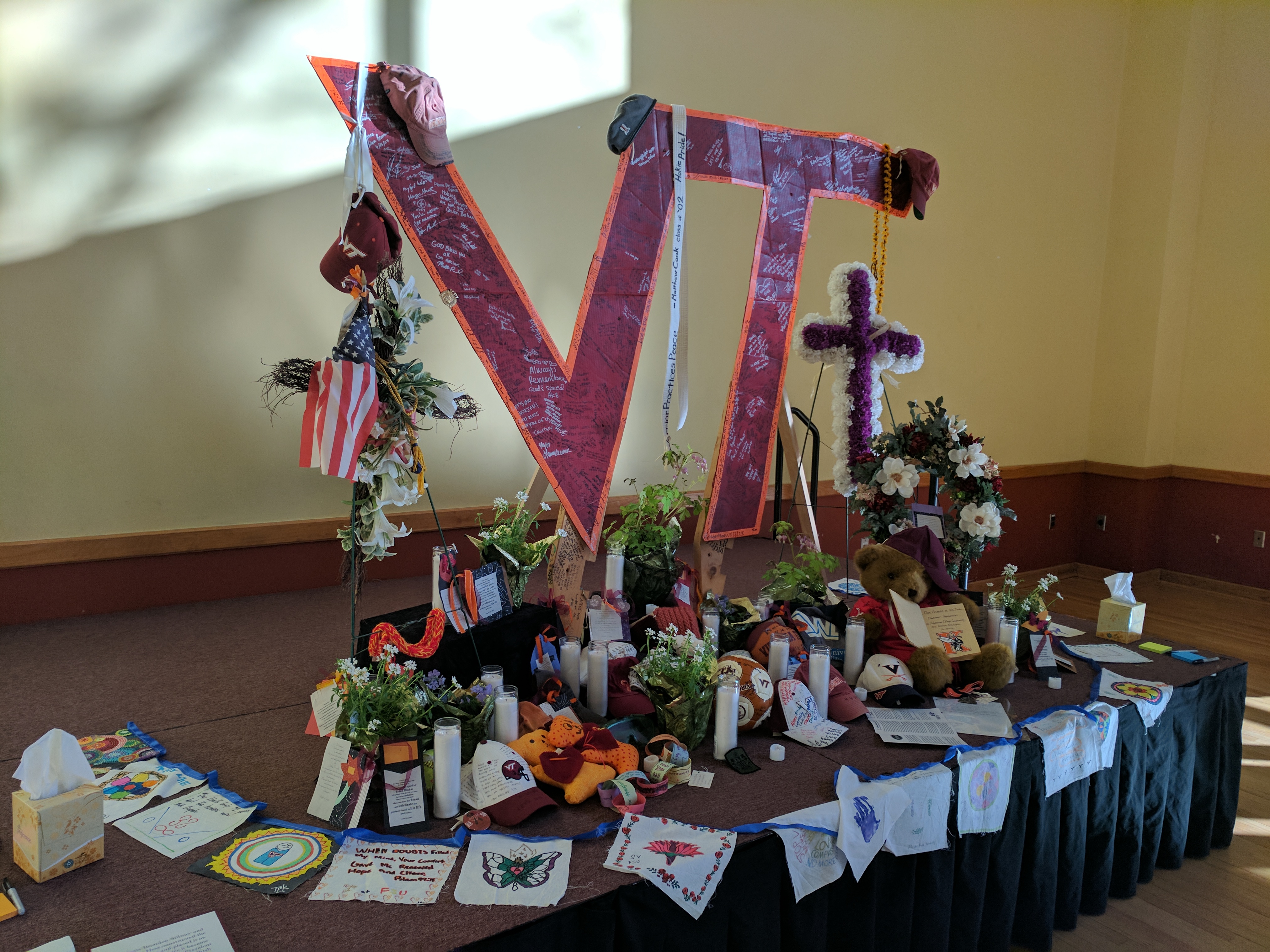 Condolence items from colleges and universities, including the large VT shrine and a sample of the white boards signed locally on the Drillfield University Libraries in partnership with Student Engagement and Campus Life Old Dominion Ballroom, Squires Student Center. 2017/04/07 - 2017/04/17