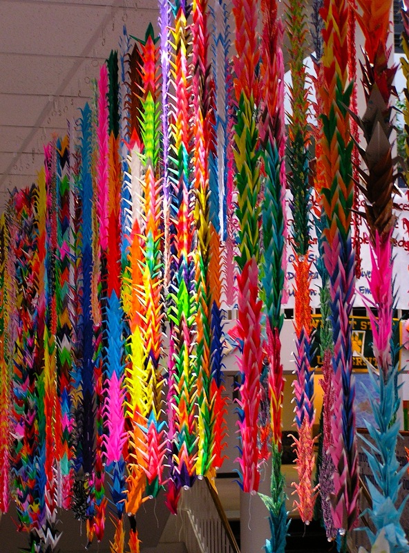 Paper cranes suspended from ceiling in Squires Student Center