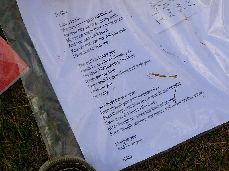 A poem written by "Erica" to Cho reads, "I am a Hokie. You can not…"