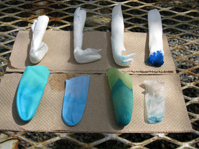 Close up of four types of glove fingers demonstrating chemical permeation with dye.