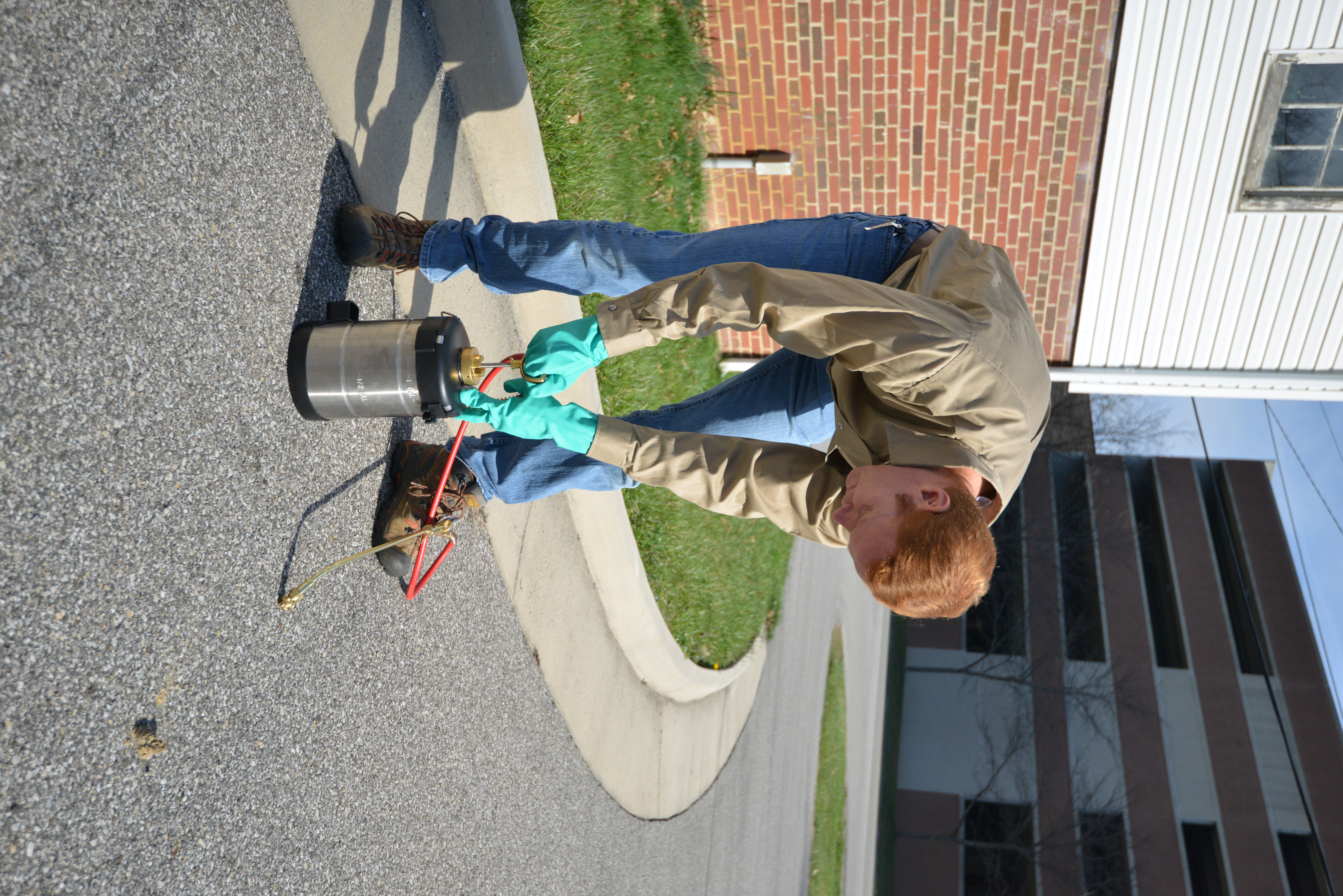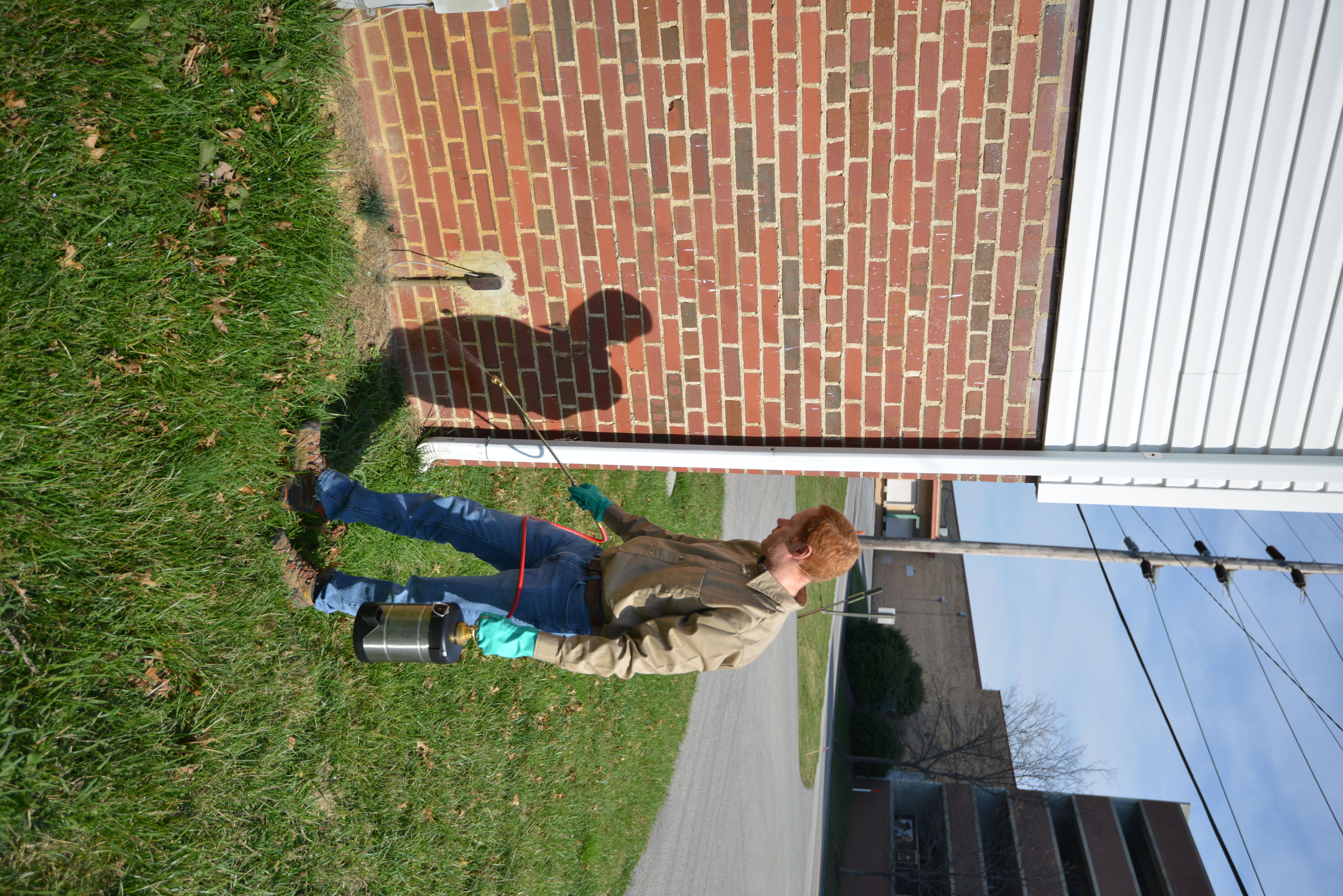 An applicator operating a B&G 1 Gallon Stainless Steel Sprayer along the brick foundation of a building while wearing nitrile gloves. There is a closeup shot of the brass nozzle spraying a liquid product.