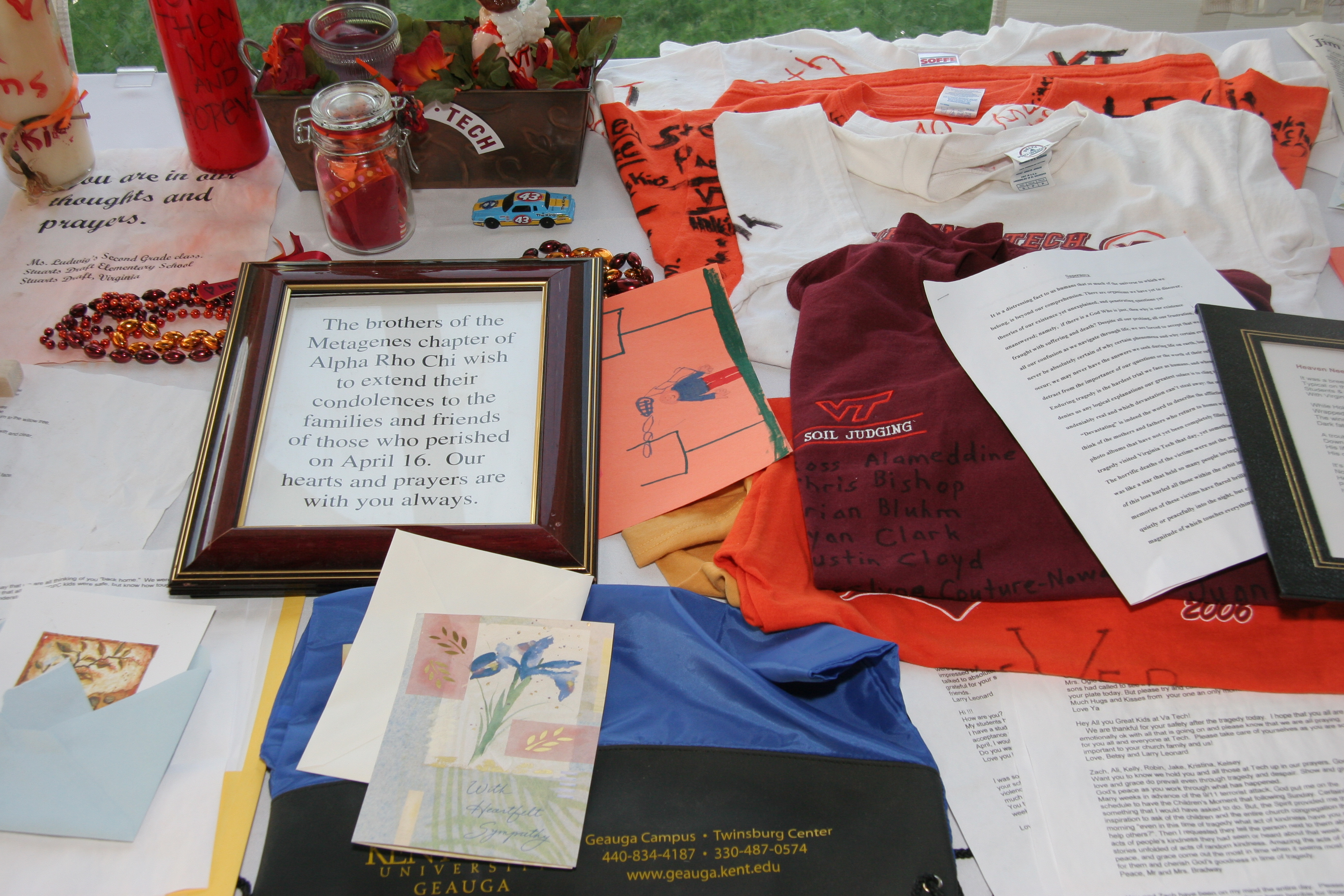 Framed print of Alpha Rho Chi condolences, T-shirt, and condolence cards on memorial table
