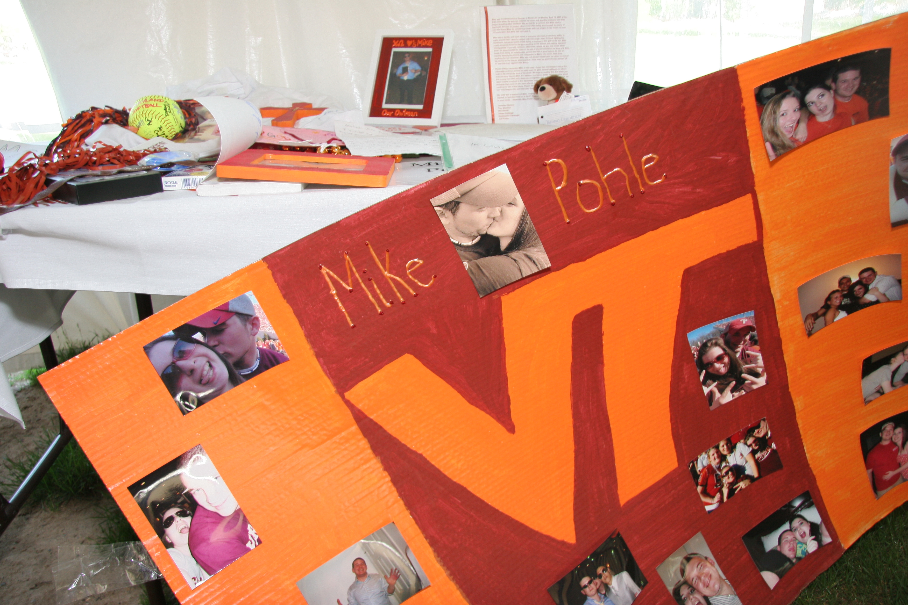 Poster with photographs near Mike Pohle's memorial table