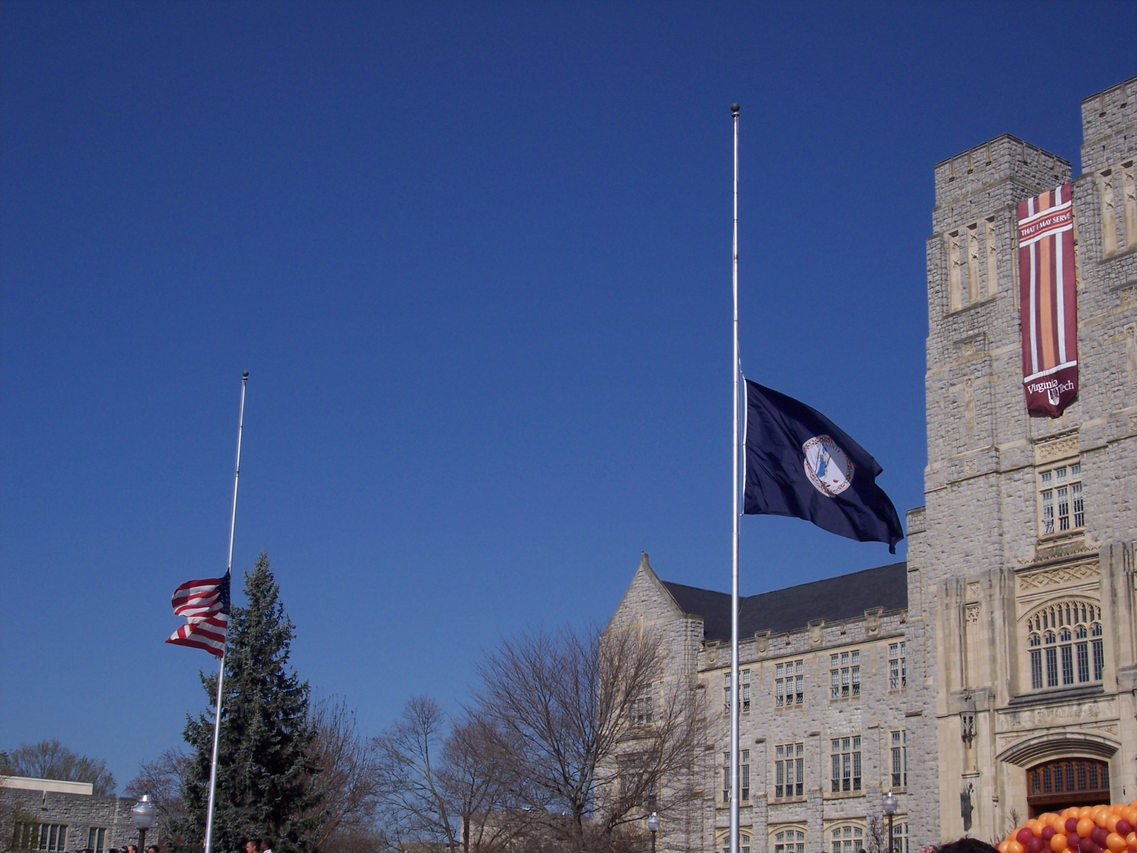 Flags at half-mast in front of Burruss Hall