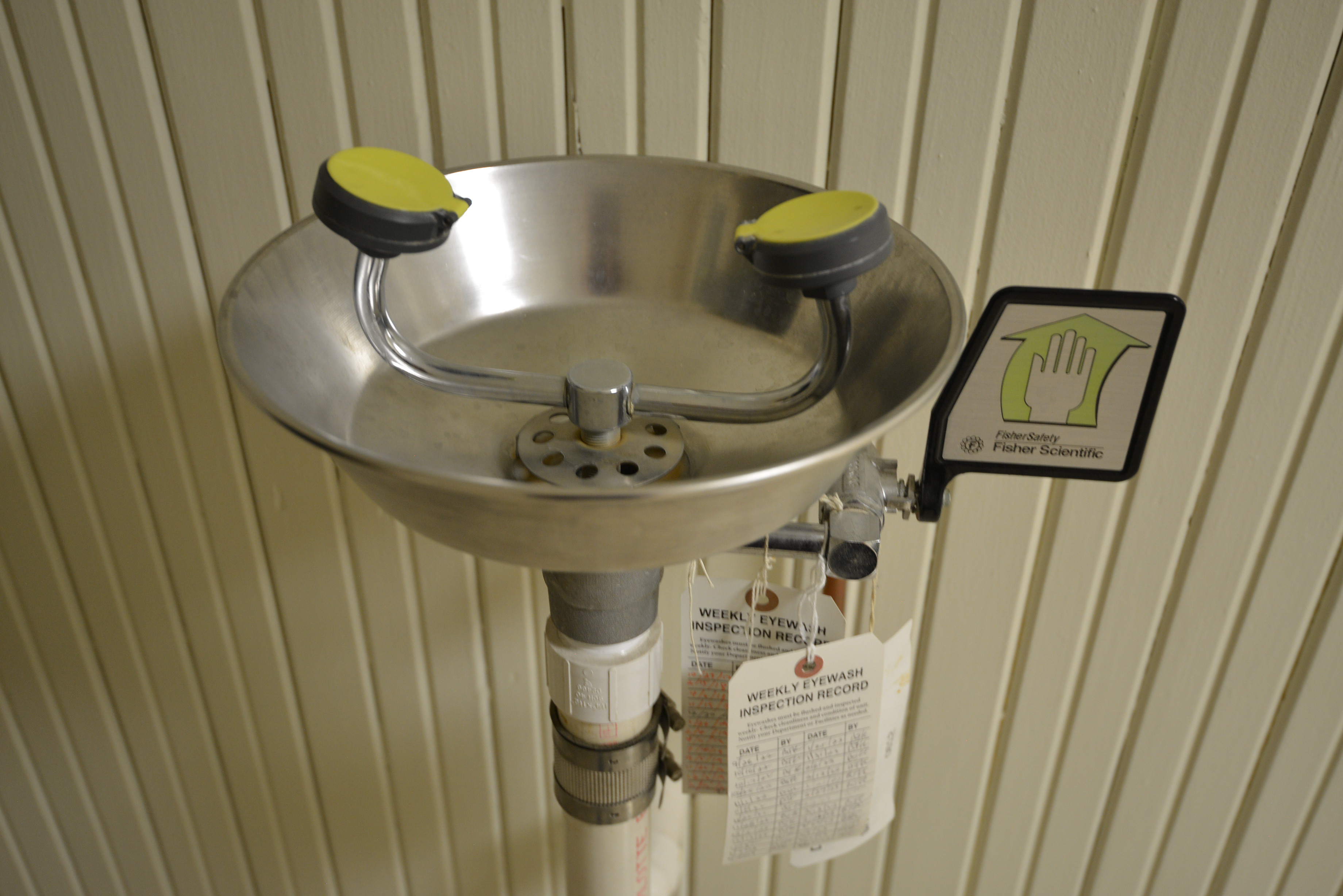 An indoor emergency eyewash dispenser station that is connected to the building's water supply. It has weekly inspection record tags hanging from a horizontal pipe. If a pesticide label requires goggles for eye protection, the Worker Protection Standard requires that pesticide handlers must have an eyewash dispenser available at all times.