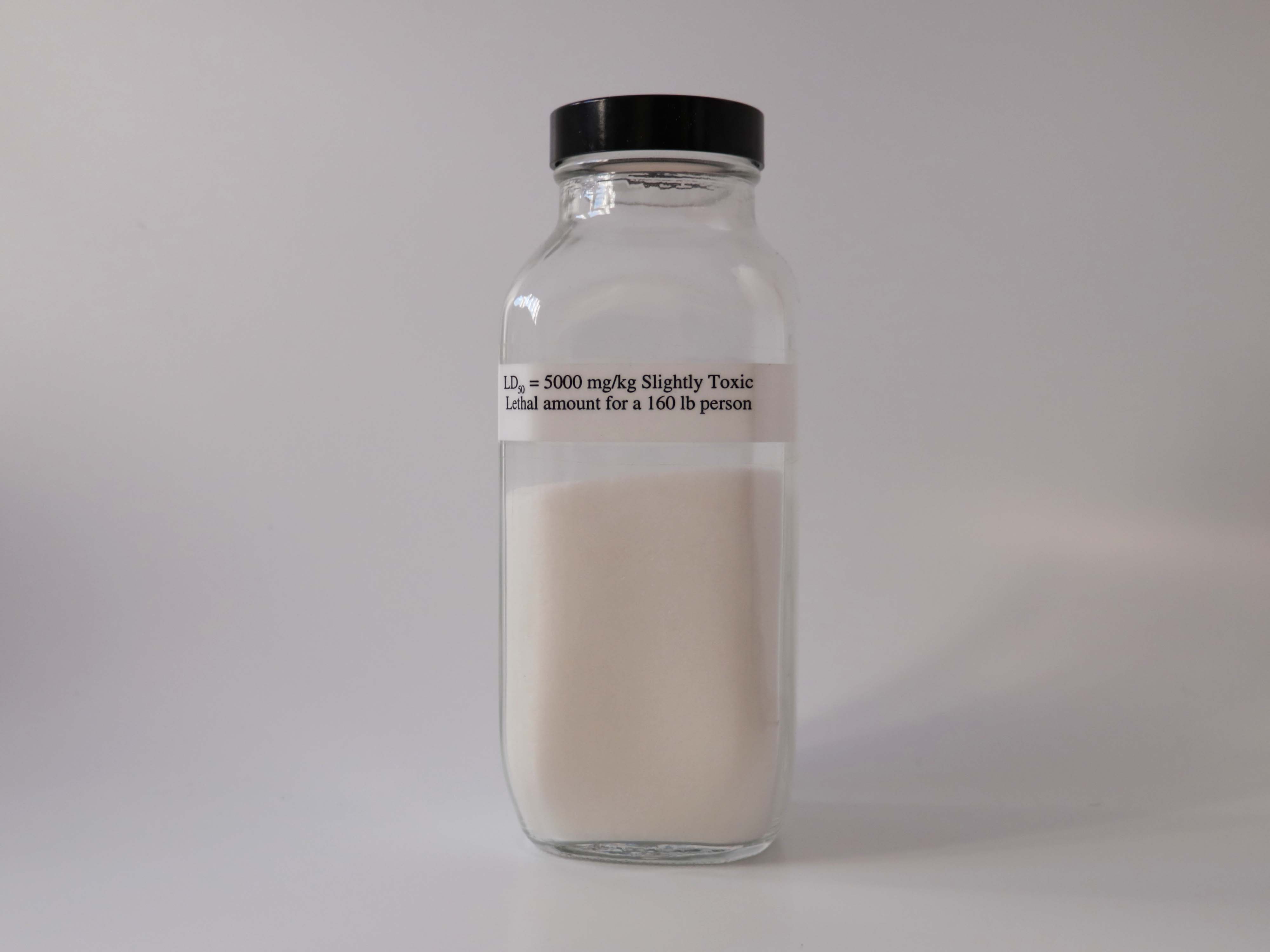 Glass jar from an LD50 Demo Kit that contains salt to represent a dry formulated pesticide. This jar visually represents an oral LD50 of 5000mg/kg for a 160 lb adult, which would have a signal word of Caution. These LD50 toxicity levels are categorized as Slightly Toxic and Hazard Class III.