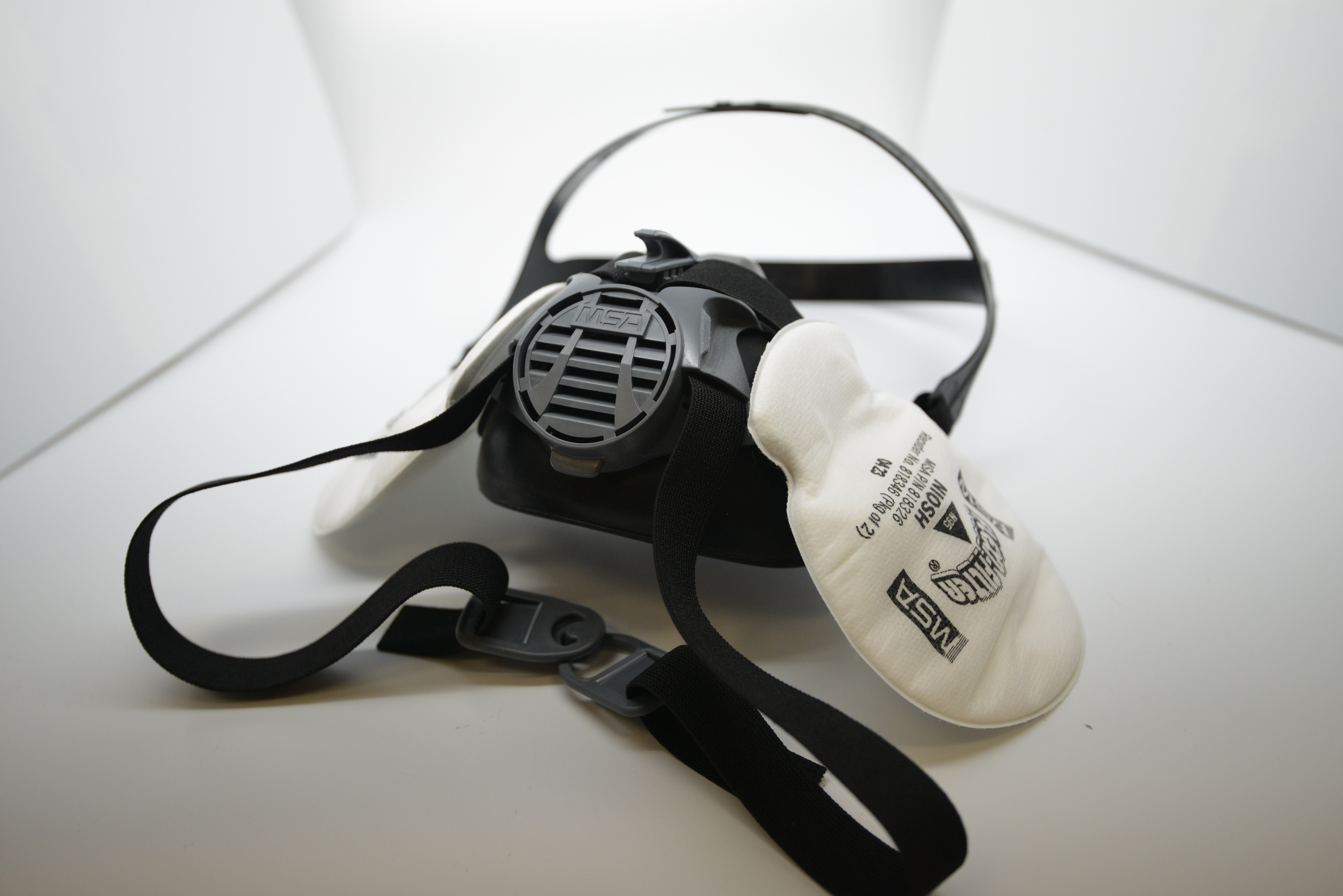 MSA half-face respirator with white N95 flexi-filters. N95 means it filters at least 95% of airborne particles and is not resistant to oil.