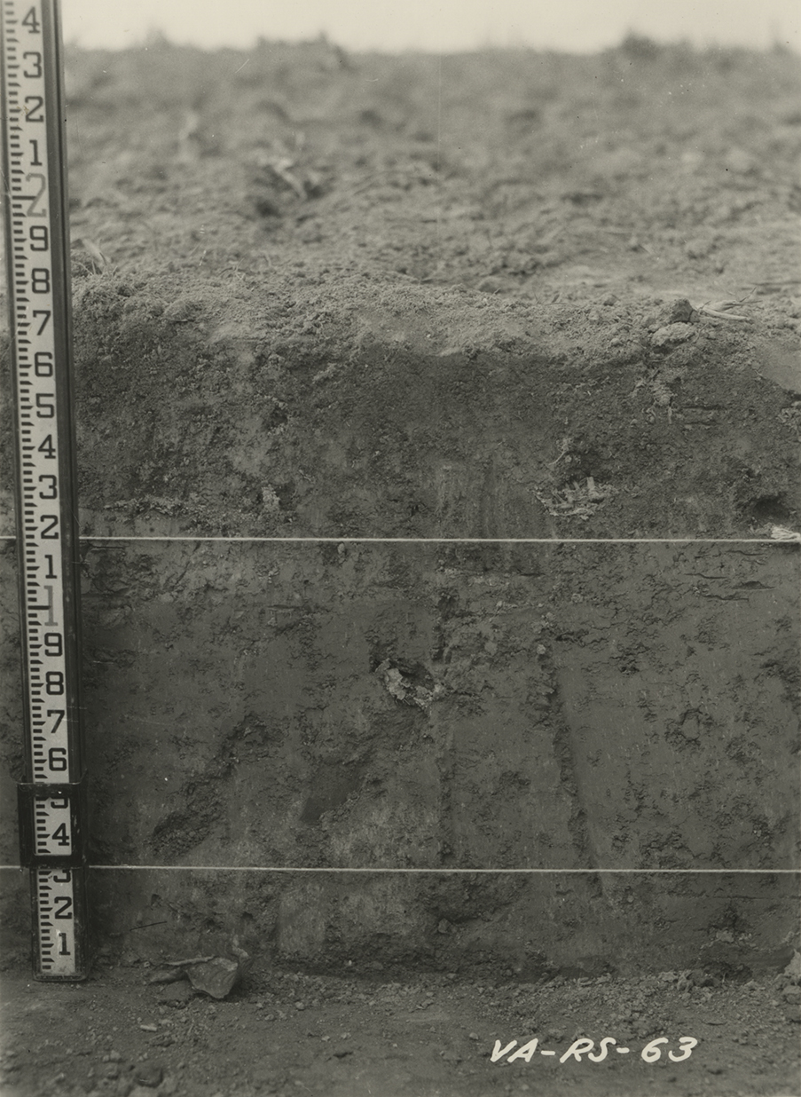View of pit showing badly eroded soil on W-III. Top white string shows depth of plowed layer (Ap) whereas the lower string shows division of B and C horizons.