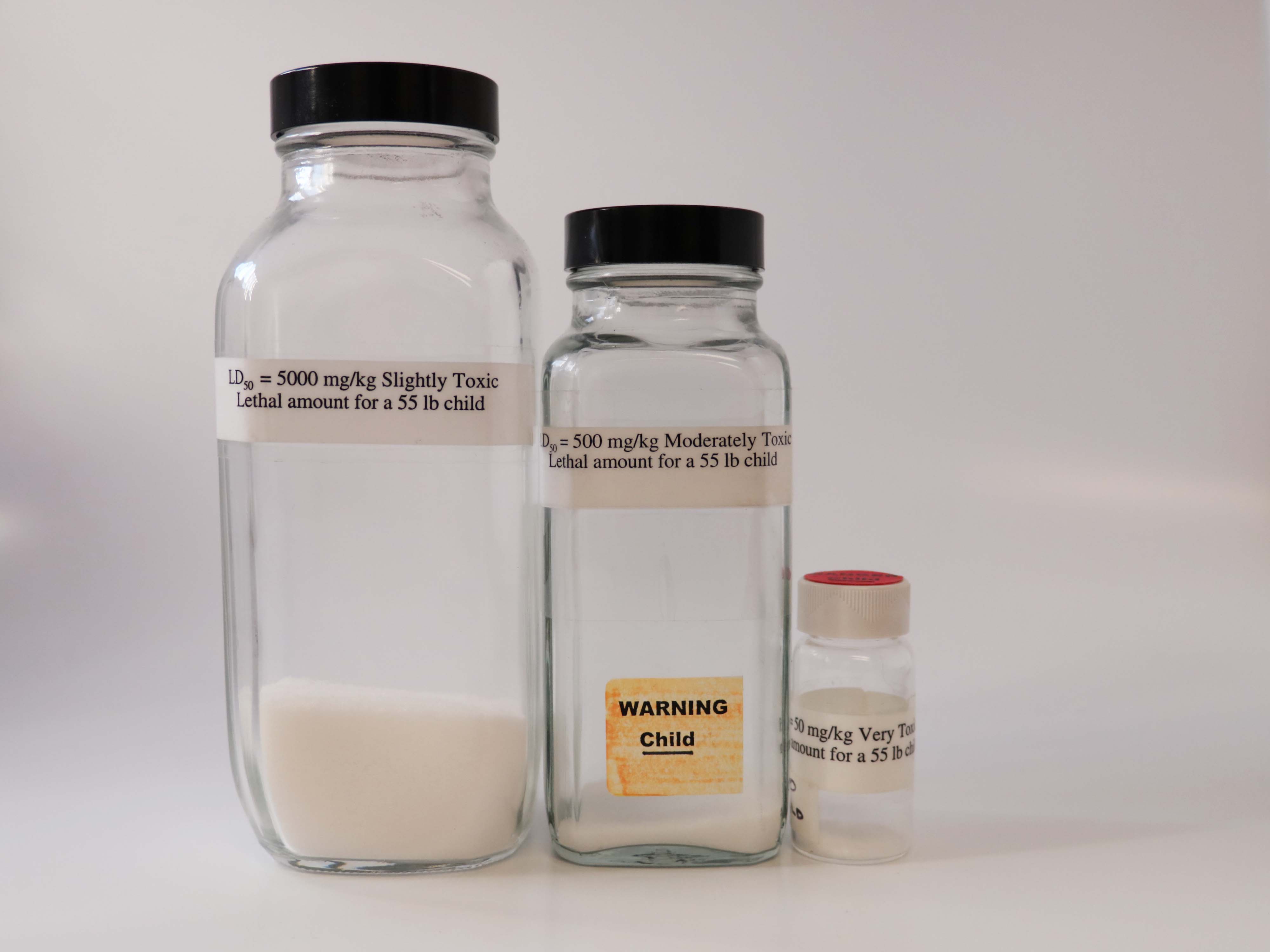 Glass jars from an LD50 Demo Kit that contains salt to represent a dry formulated pesticide. These jars visually represent oral LD50 quantities for a 55 lb child. The jar on the left has an LD50 of 5000mg/kg which would have a signal word of Caution and is categorized as Slightly Toxic and Hazard Class III. The jar in the middle has an LD50 of 500mg/kg which would have a signal word of Warning/Aviso and is categorized as Moderately Toxic and Hazard Class II. The jar on the right has an LD50 of 50mg/kg which would have a signal word of Danger/Peligro and is categorized as Highly Toxic and Hazard Class I.