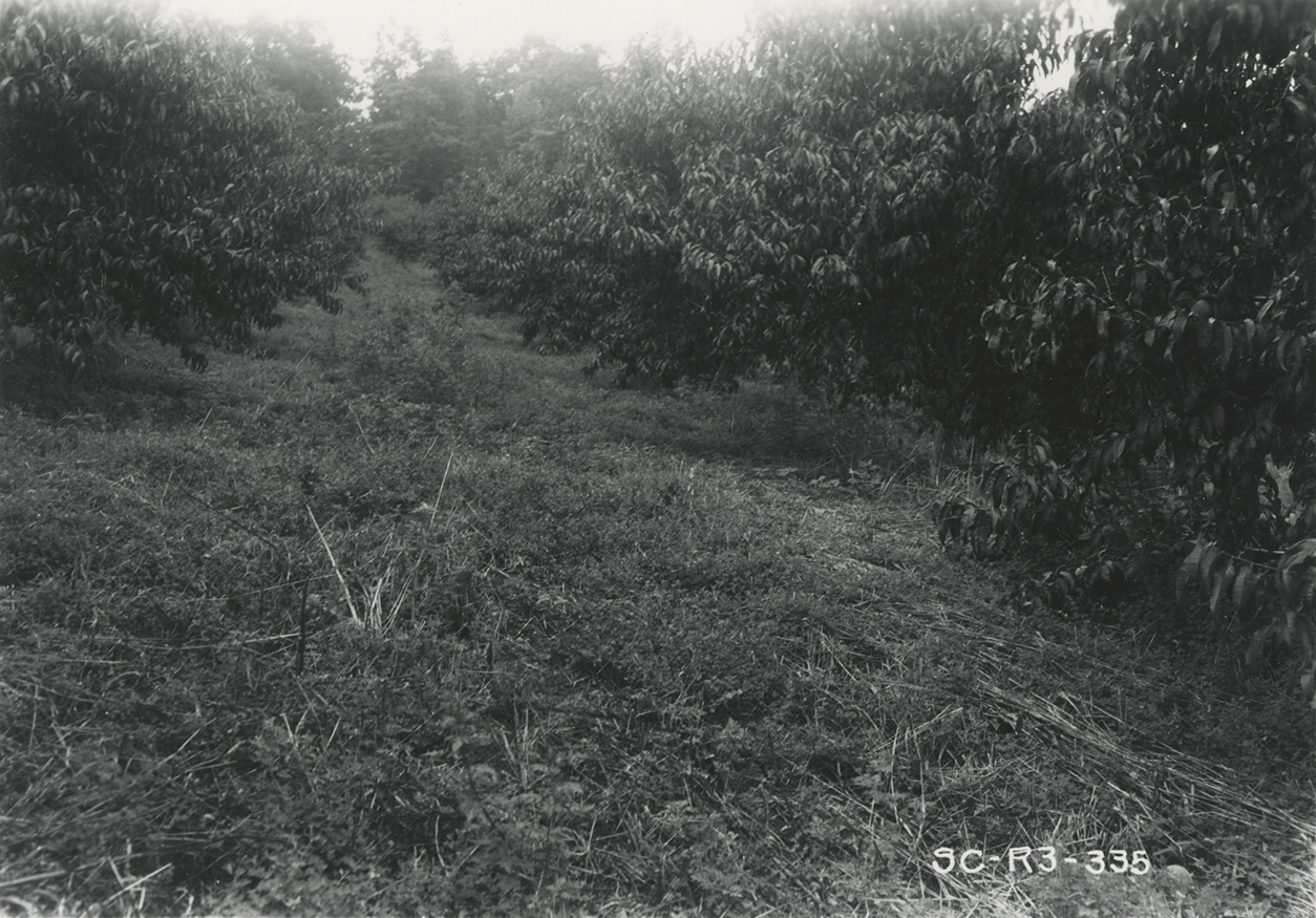 Korean lespedeza cover crop in bearing beach orchard. Rye planted in fall, mowed in spring to form straw mulch. Note weeds in middle not so easily mowed.