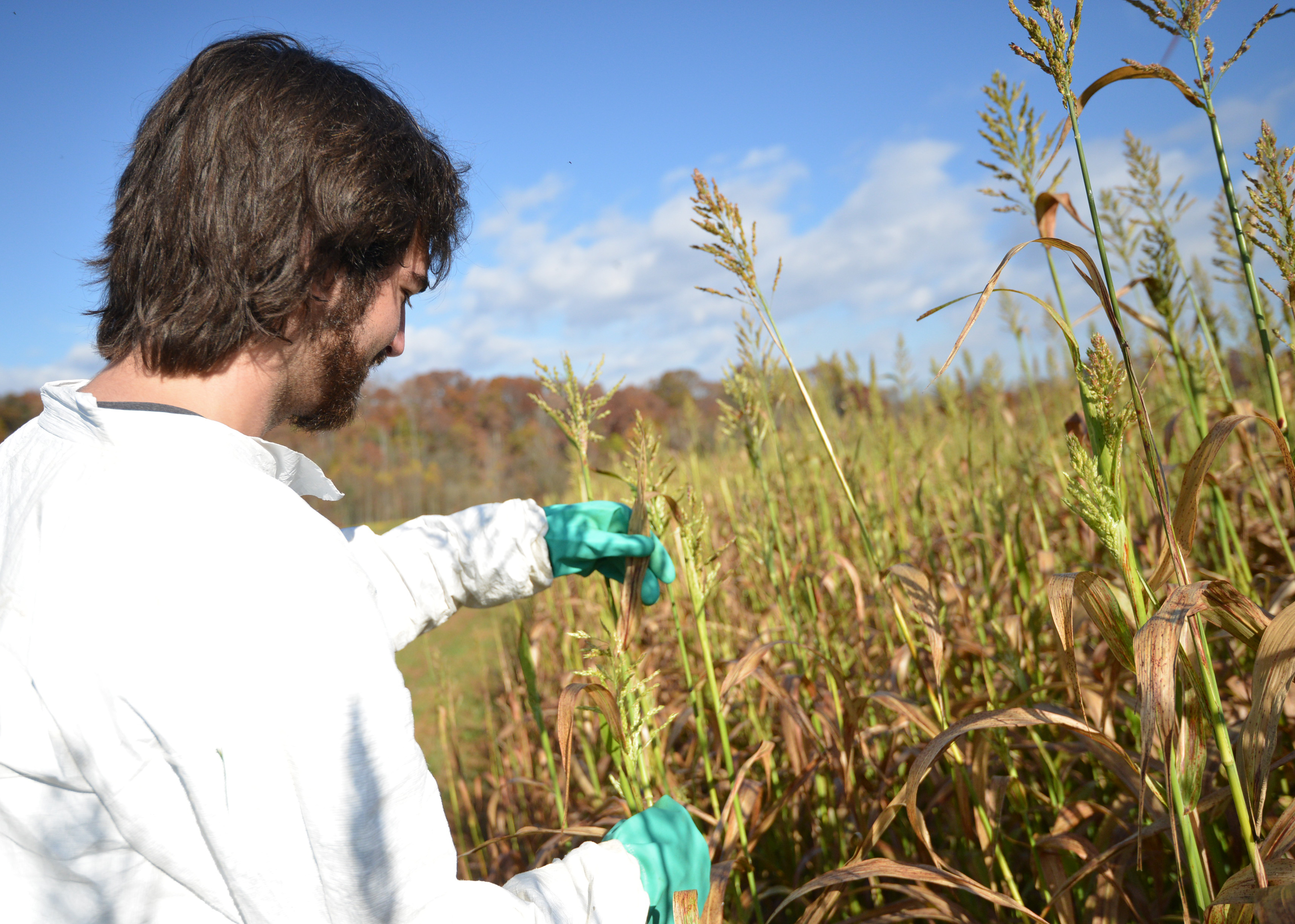 | dc.description.abstract | An applicator wearing a chemical resistant suit and nitrile gloves is monitoring for pests on a stalk of corn. They are inspecting around the leaf blade and sheath for the presence of pests or disease. | en |