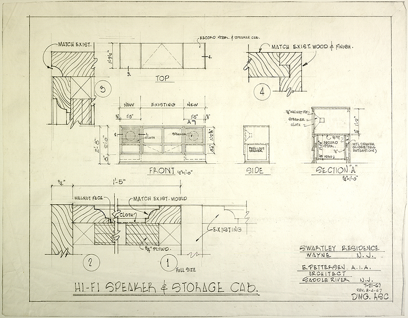 Swartley Residence, Pine Lakes, in Wayne, New Jersey. Hi-fi speaker and storage cabinet plan