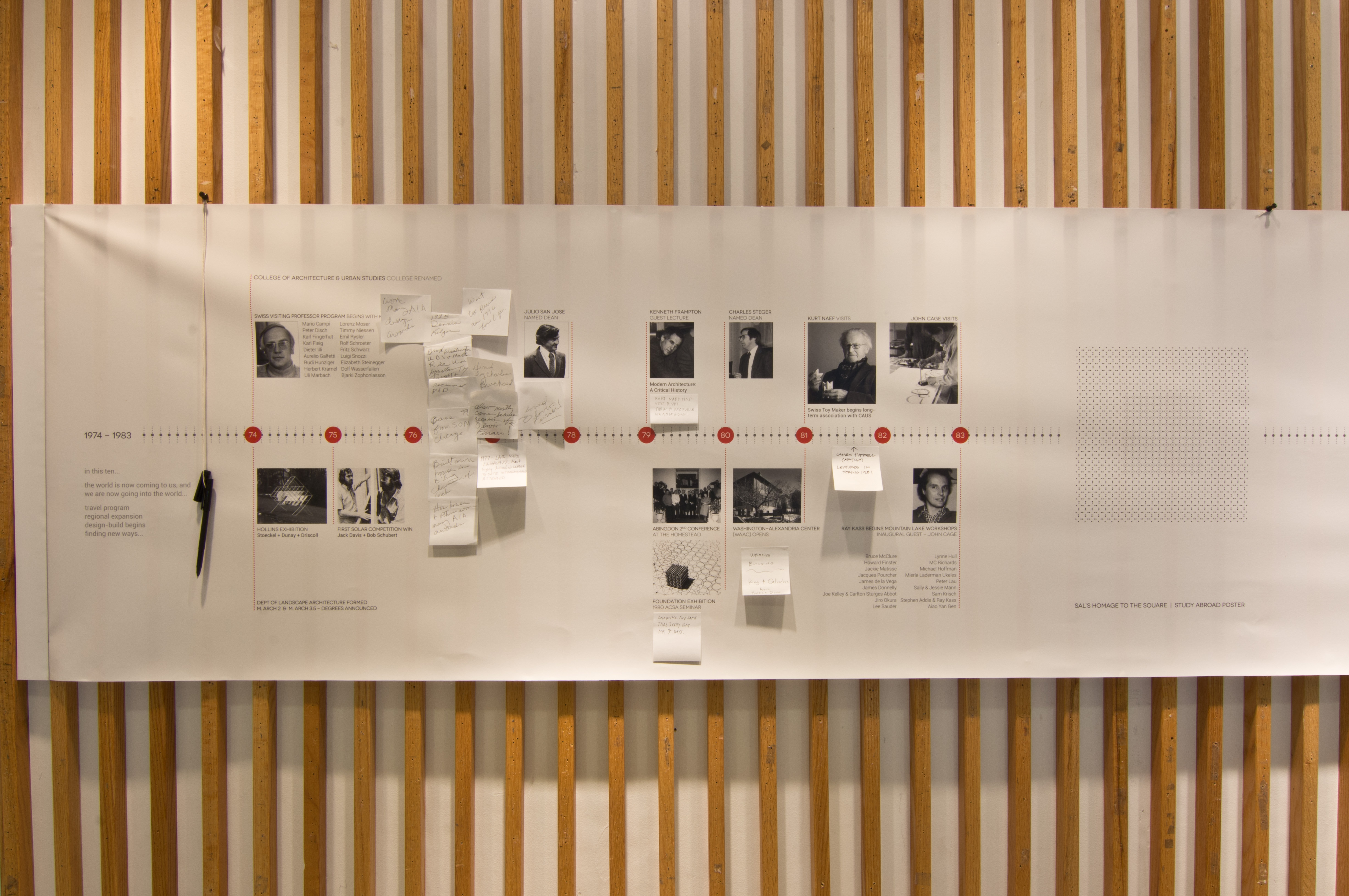 Timeline of the history of the College of Architecture of Urban Studies, exhibited in Cowgill Hall in conjunction with the College's 50th anniversary. Notes were added by alumni attending the events.