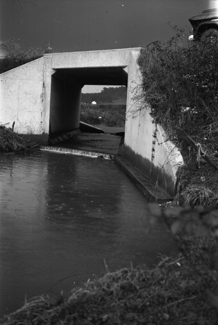 Cleaning out of channel lower end of culvert. Removing restriction causing damming effect back through the culvert over weir. This folder shows pictures of the problem, removing the problem, condition of creek after problem has been removed. Note: the restriction was caused by storm runoff from Hurricane Gracie. Looking upstream at downstream end of culvert.