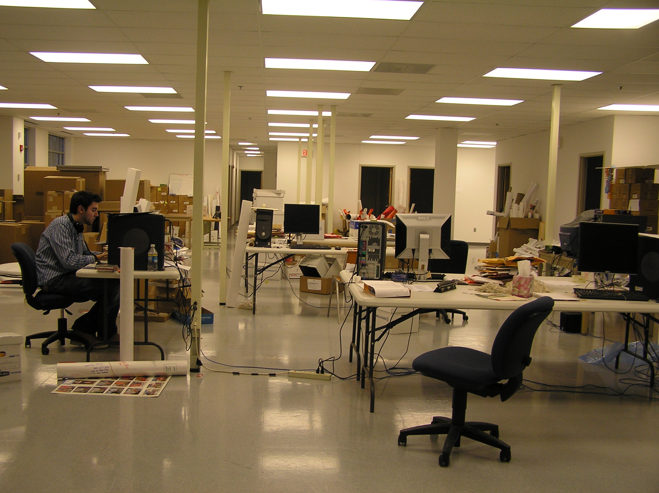 Workstations and boxes in main room at the Corporate Research Center