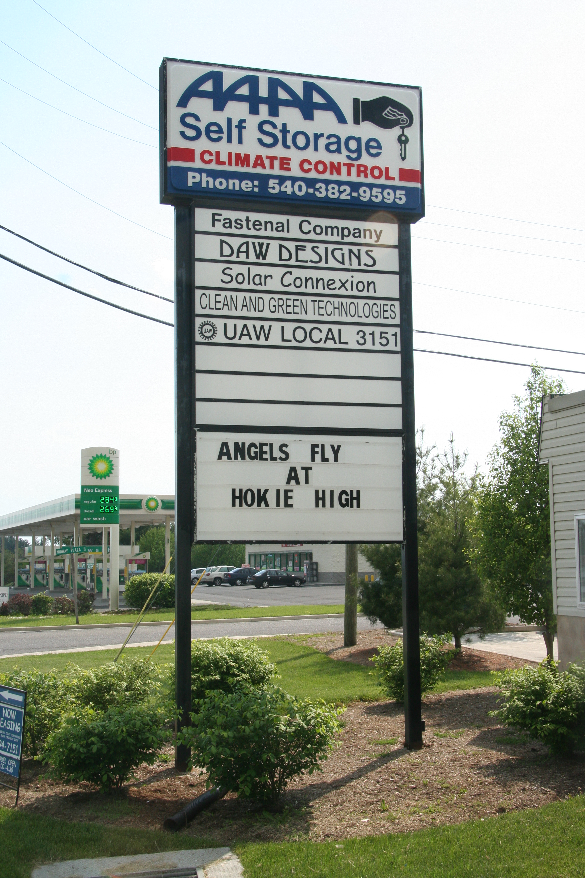 AAAA Self Storage sign - "Angels Fly at Hokie High"