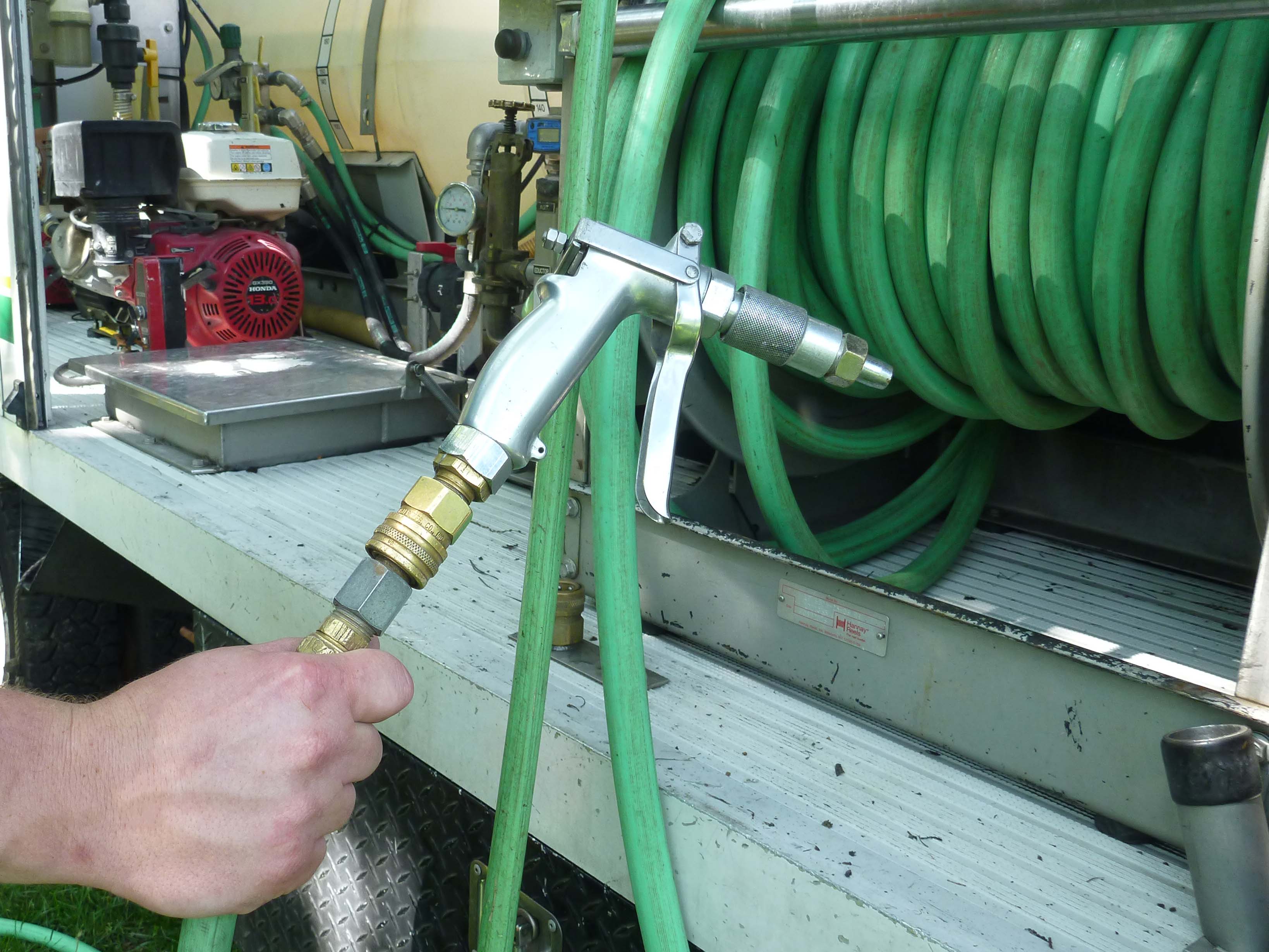 Heavy duty spray gun attached to the hosing of a truck mounted skid spraying system.