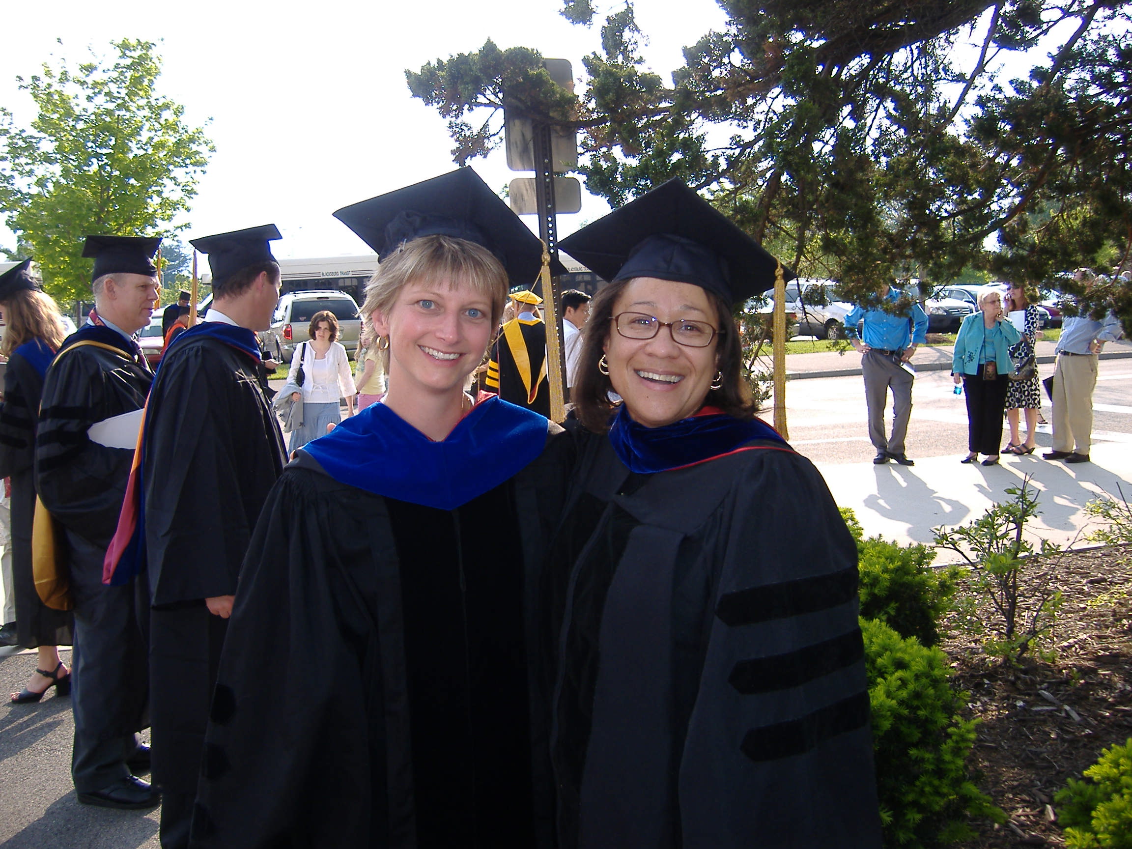 Doctoral candidate wearing her cap with "We will prevail! VT" printed on the mortarboard
