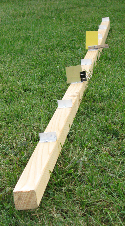 An 8ft long wooden pole with metal brackets installed at 12 inch intervals. Yellow water-sensitive cards are attached to the metal brackets using a binder clip and a clothespin. This was used as part of a class demonstration of horizontal spray drift and droplet size.