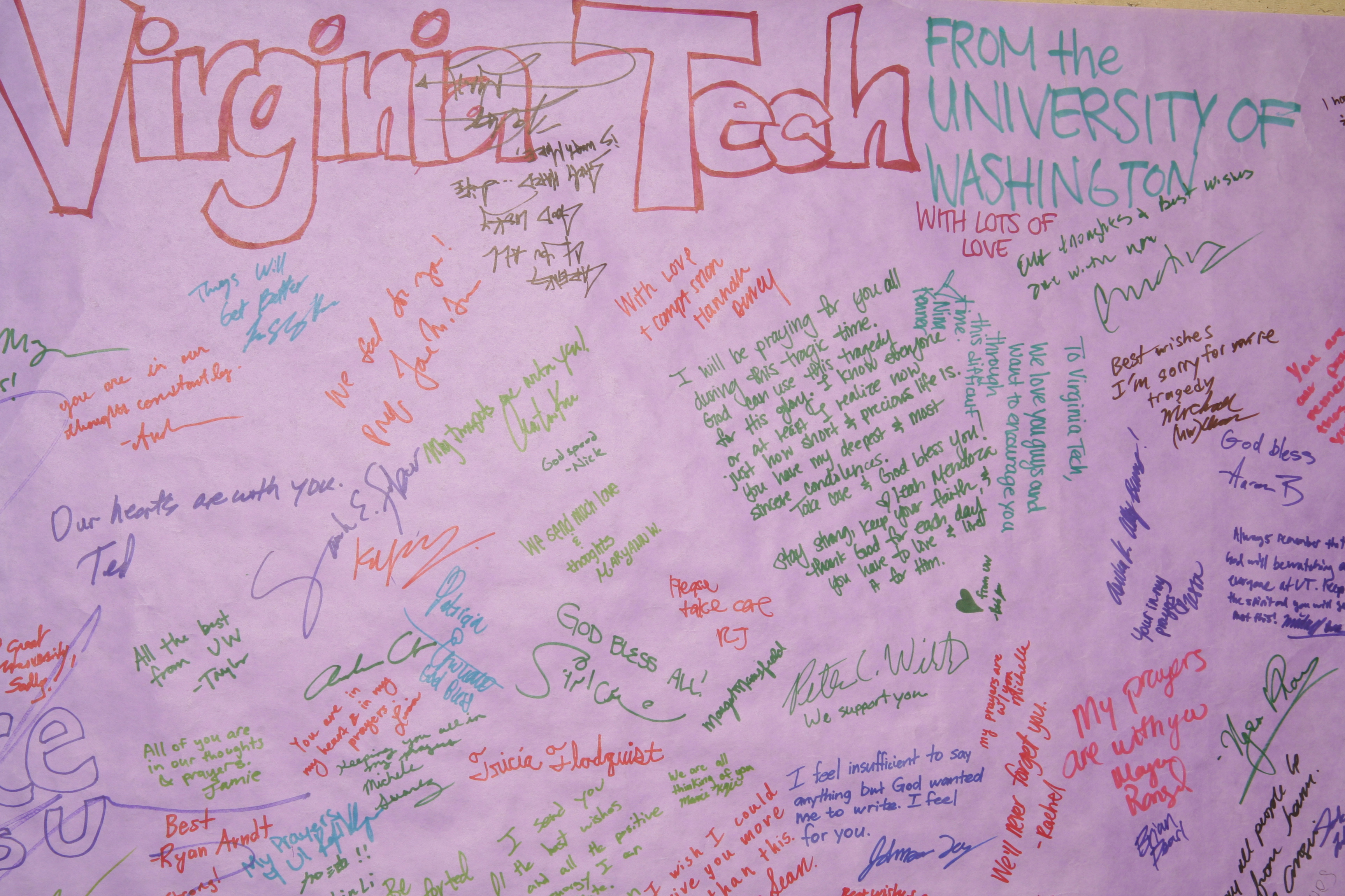 Two views of a purple paper banner with hand-written message in lettering with signatures in bright colors
