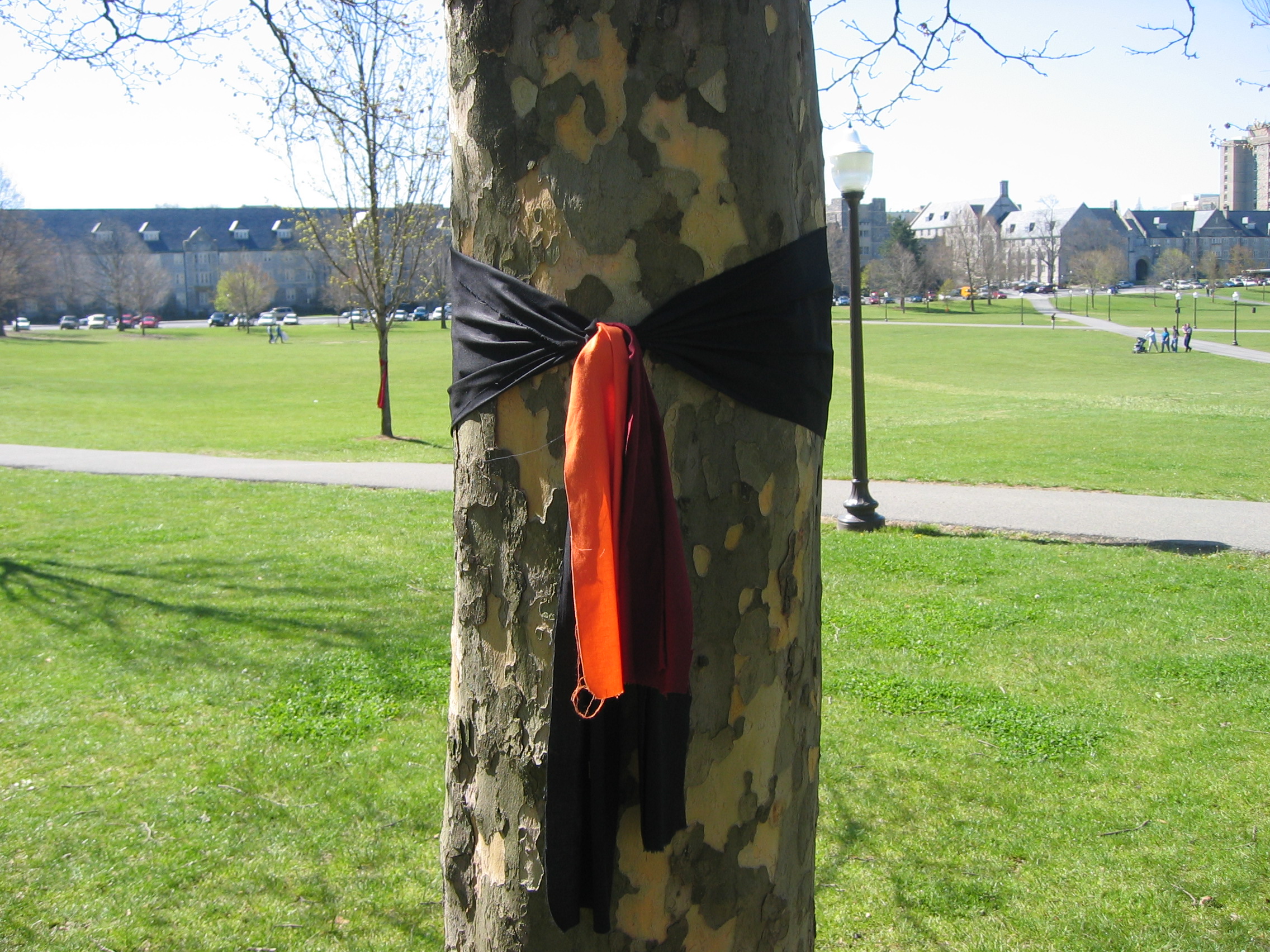 Black, orange, maroon ribbon tied around tree on the Drillfield