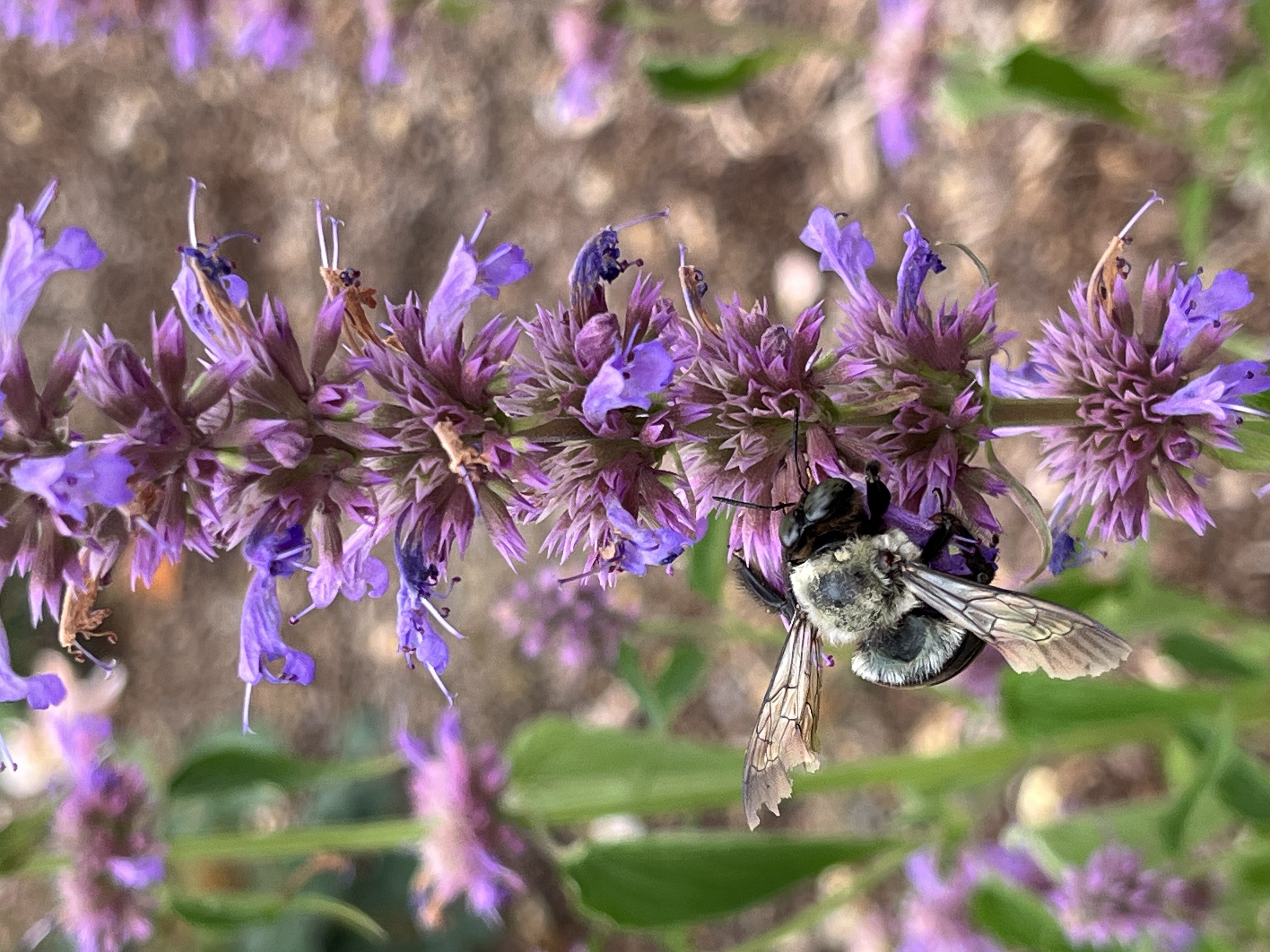 An Eastern carpenter bee (Xylocopa virginica) pollinating the flowers of anise hyssop (Agastache foeniculum) in an ornamental planting.