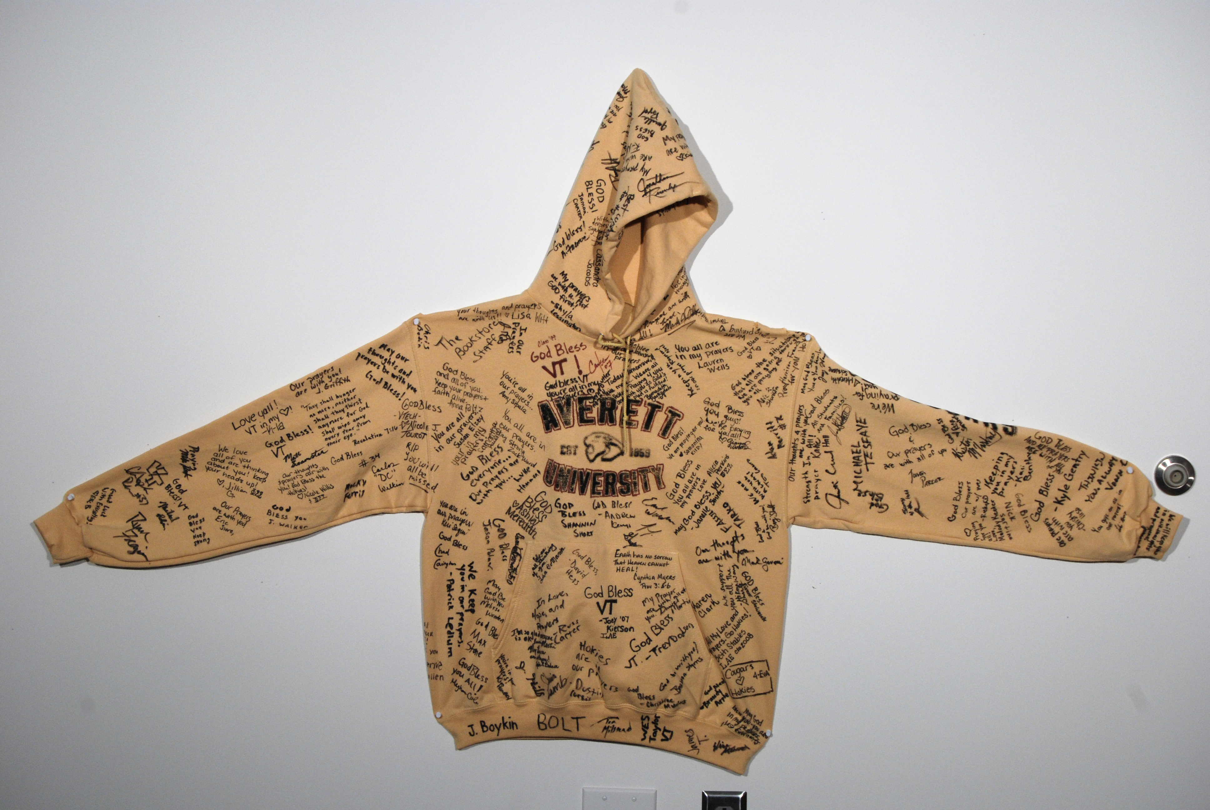 One front view of a sweatshirt with signatures and messages and a back view of the same sweatshirt