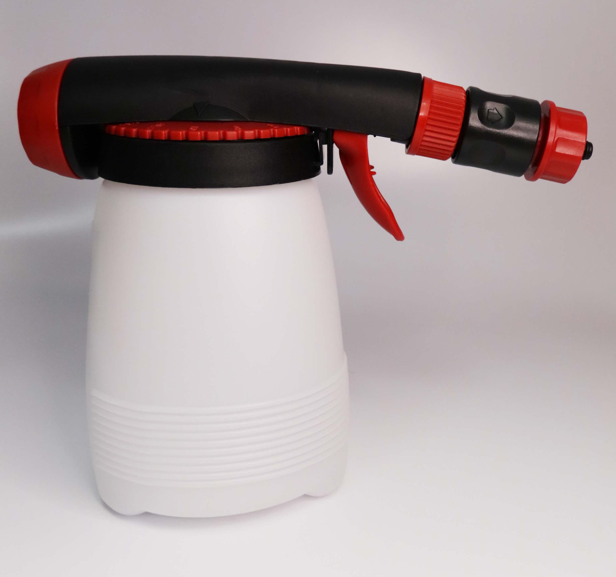 A Solo 405 HE hose-end sprayer. The flow rate can be adjusted by turned the metering dial. There are four different nozzle openings that can be rotated into use: From the top and moving clockwise: stream, cone, shower, and flat fan. (Side)