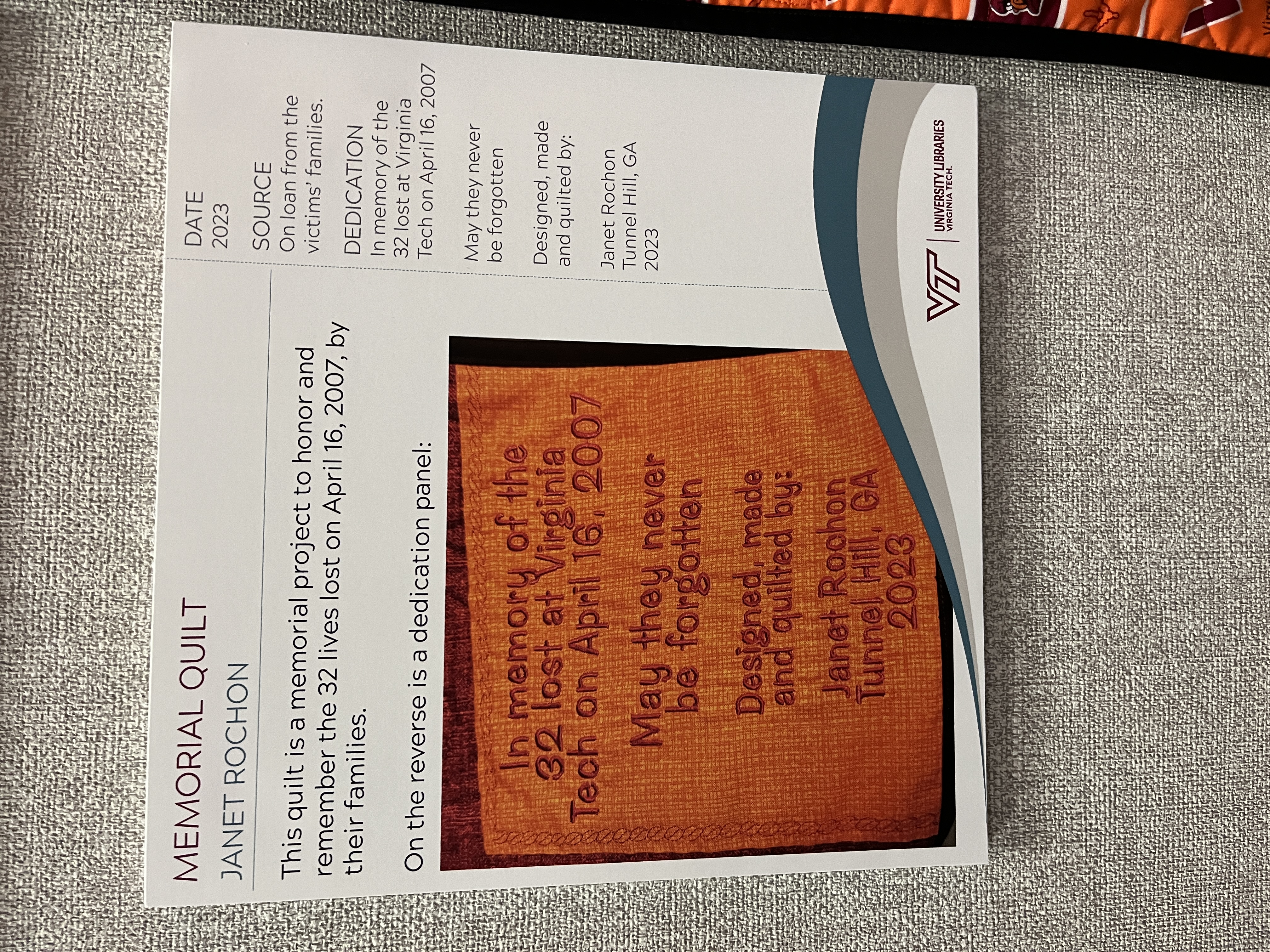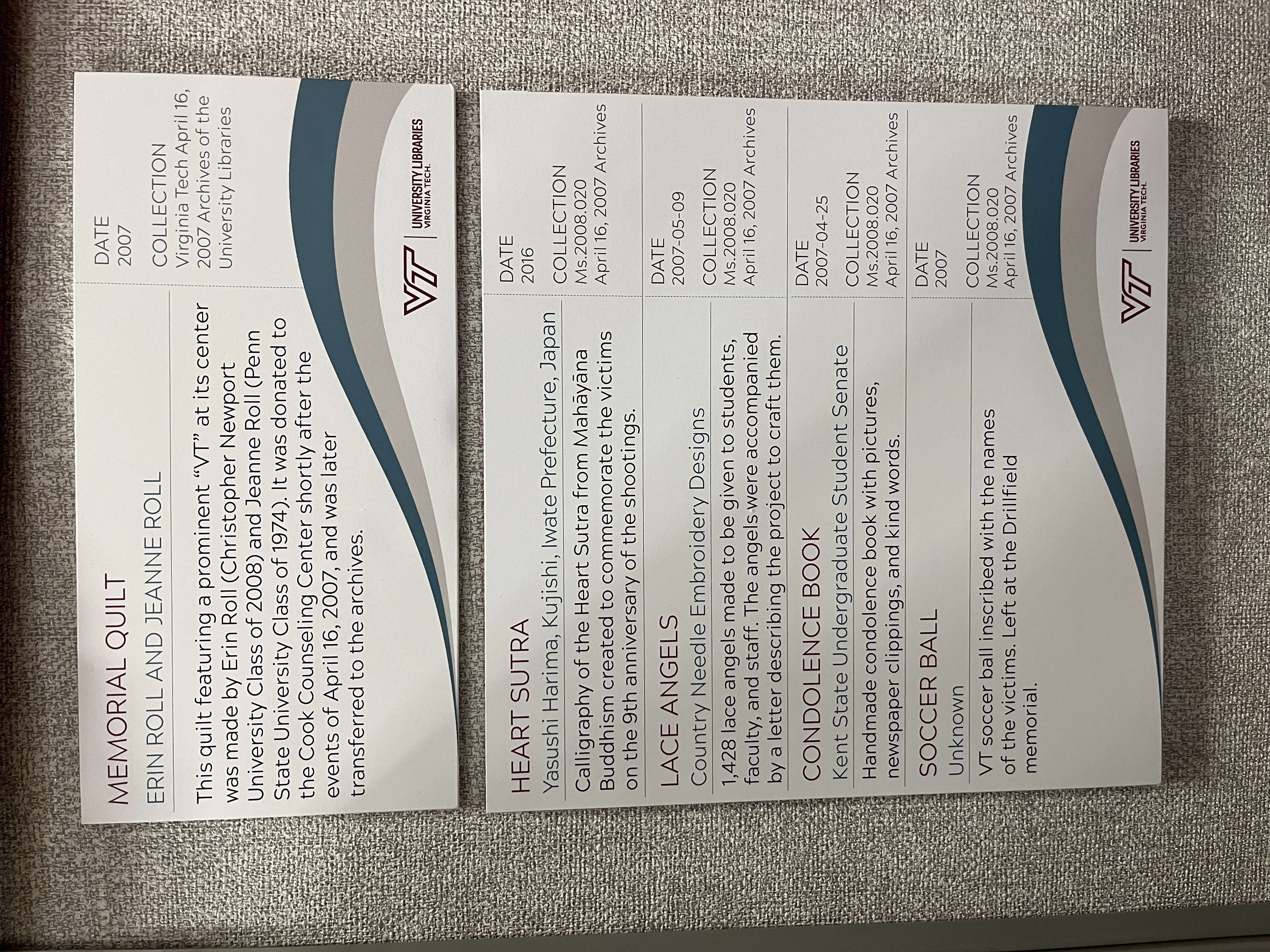 Following the events of April 16, 2007, Virginia Tech received thousands of handmade and heartfelt items to express condolences, thoughts and prayers of healing and support, and solace for the Hokie Community. This exhibit, "Handmade and Heartfelt: Selections from the April 16, 2007 Condolence Archives," highlights just a few of the collected items that were made by hand to share the hearts of the world with the Hokie Community.