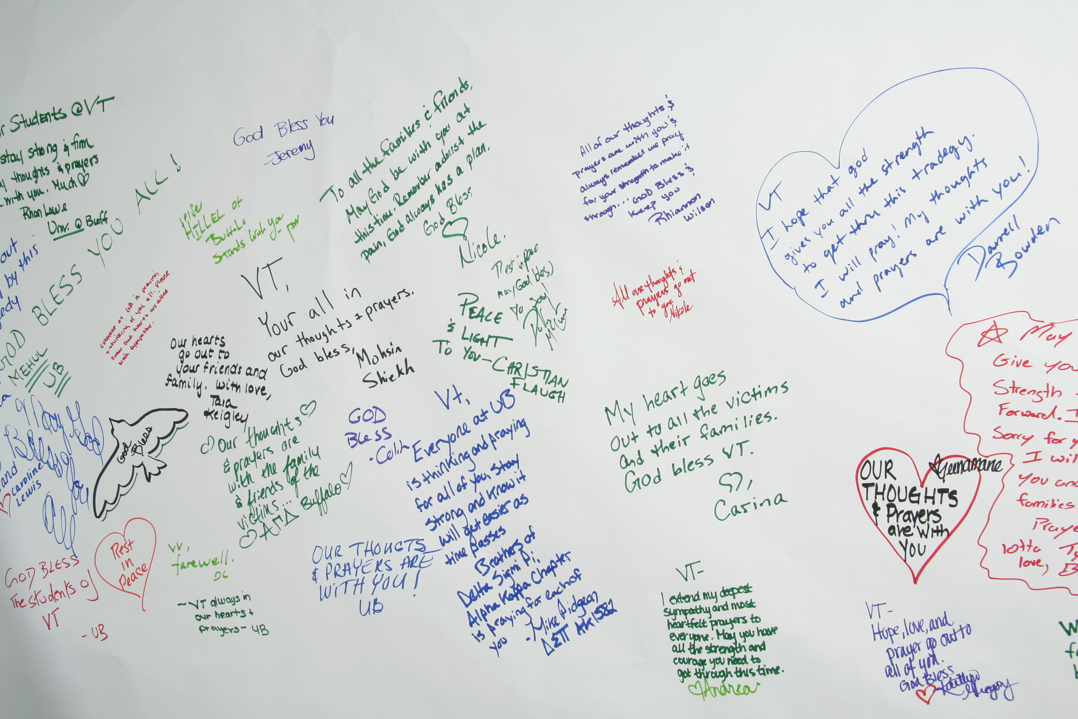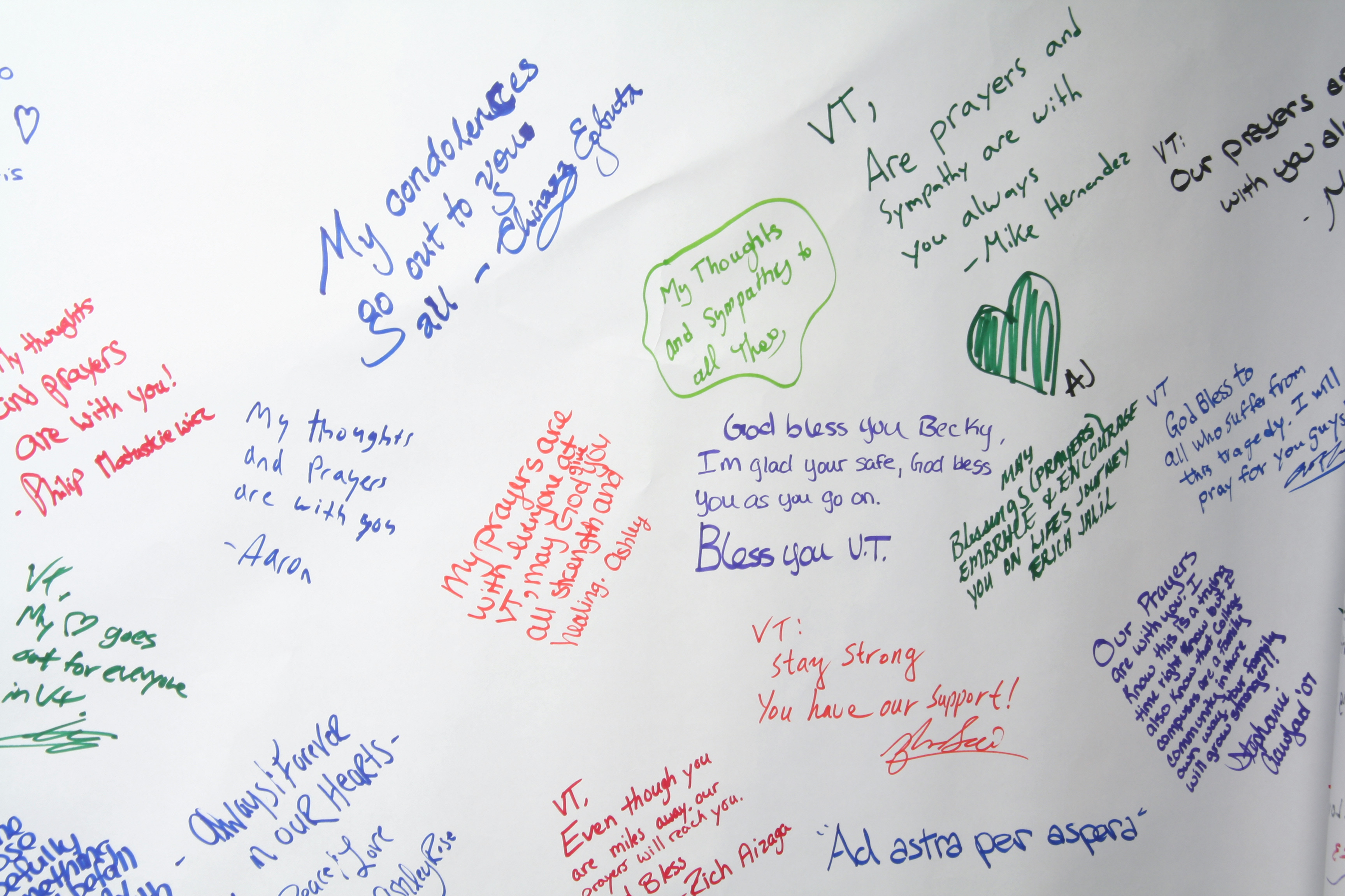 Two white paper banner made of heavy stock and marker signatures in primary colors