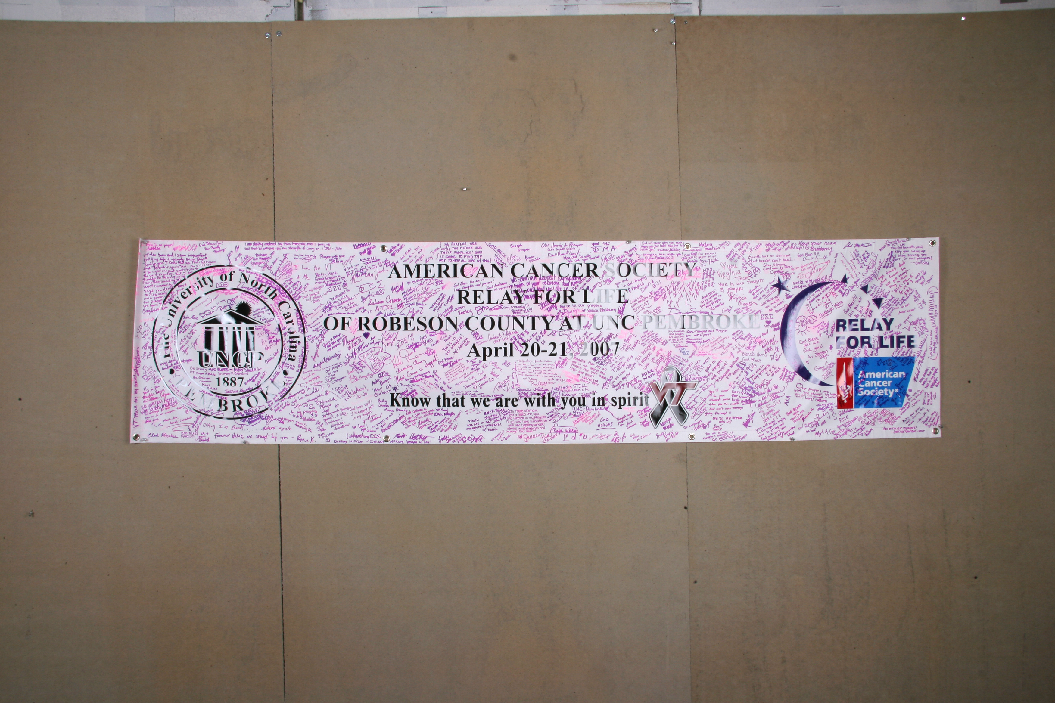 | dc.title | Plastic banner with printed message: "Know that we are with you in spirit," and originating organization logos with messages and signatures in purple marker from Relay for Life - Robeson County | en |